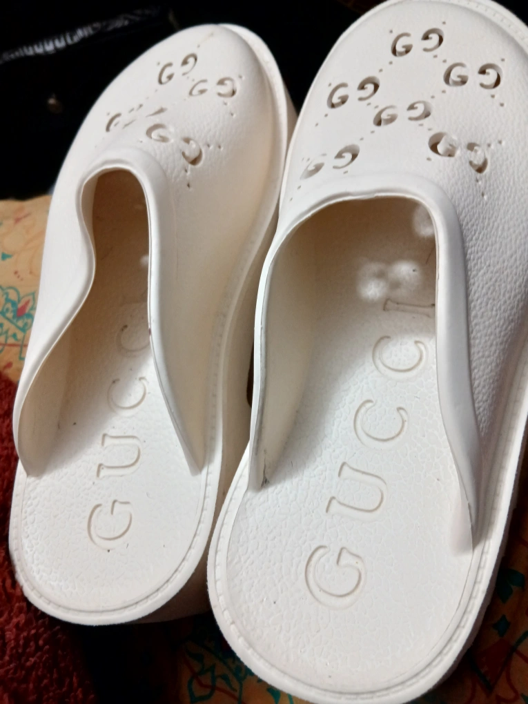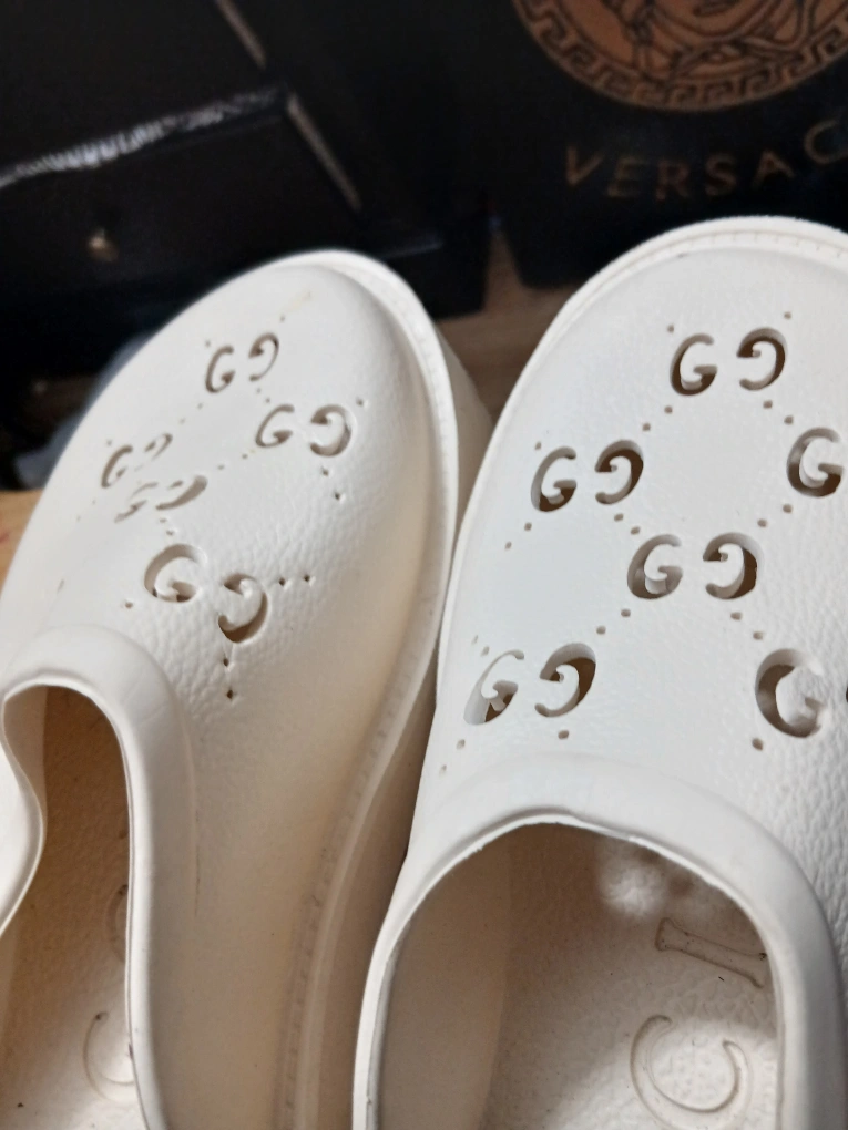 These are a pair of white rubber slides from Gucci. They feature the Gucci logo pattern throughout. Great for everyday wear!
