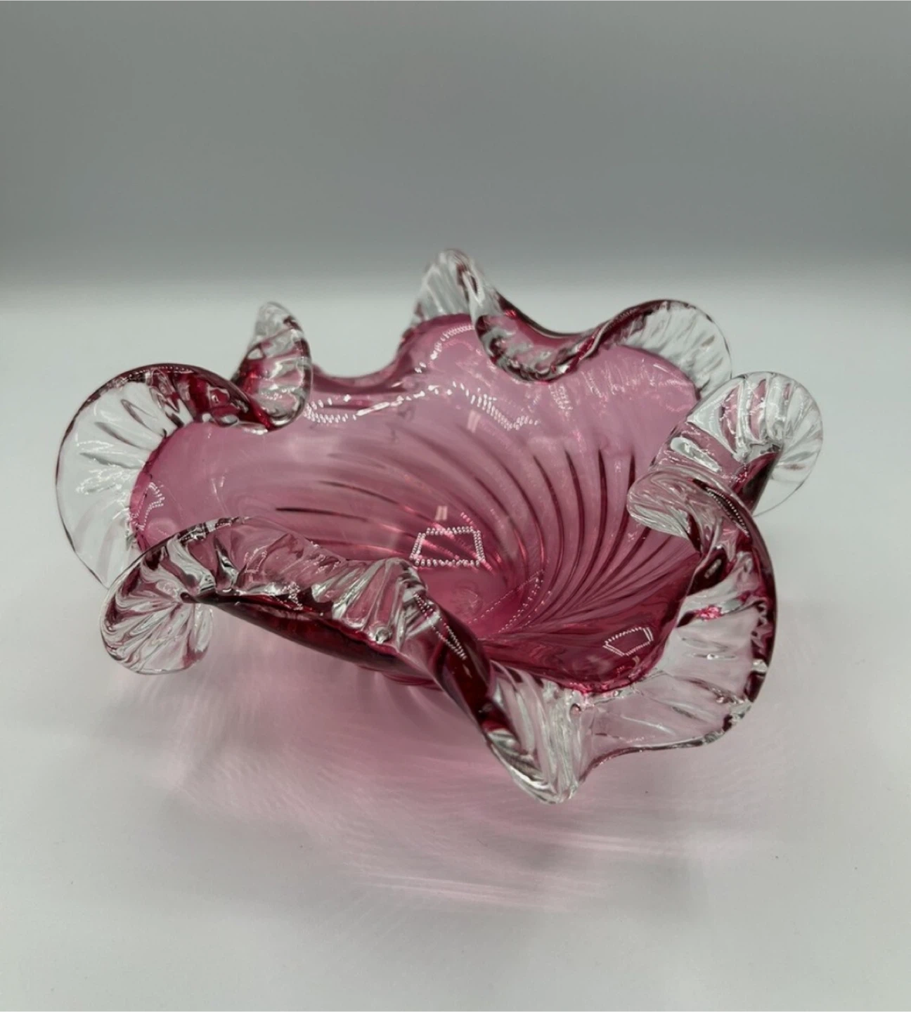 Beautiful pink Murano style glass bowl with a ruffled edge. It would make a lovely addition to any room! Pick up only near unity fitness.