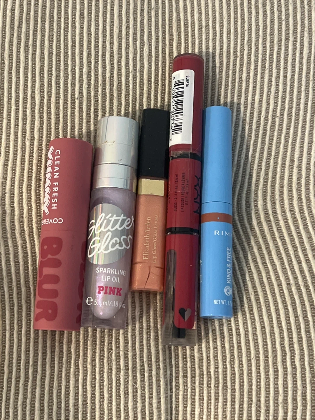 Selling a collection of lip glosses from various brands! Includes: - Covergirl Clean Fresh Blur - Glitter Gloss Sparkling Lip Oil in Pink (5ml/.18 fl oz) - Elizabeth Arden Lip Gloss - NYX Lip Color - Rimmel Kind & Free (Net Wt. 1.7g) Perfect for trying out different shades and formulas!