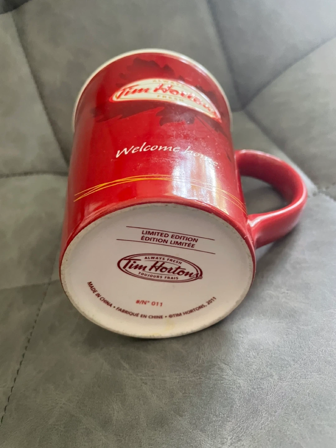 Selling a Tim Hortons mug with a red maple leaf design! It says 'Welcome home' on the front. The bottom indicates it's a limited edition item. Great addition to any coffee cup collection. Pick up is Jane and Lawrence area in North York. If AD is up item is available. Cash only. First come. Please bring exact cash as no change is available. Message on way to get address.
