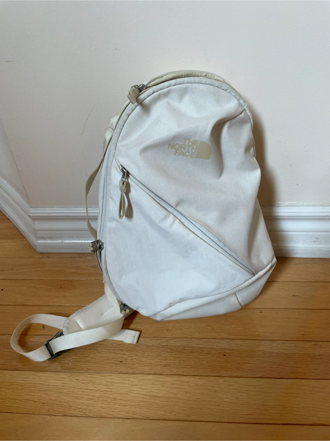 I'm selling a The North Face sling bag in white. It's in great condition and perfect for carrying your essentials around town!