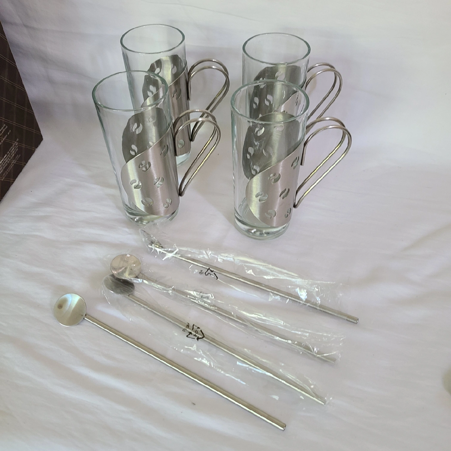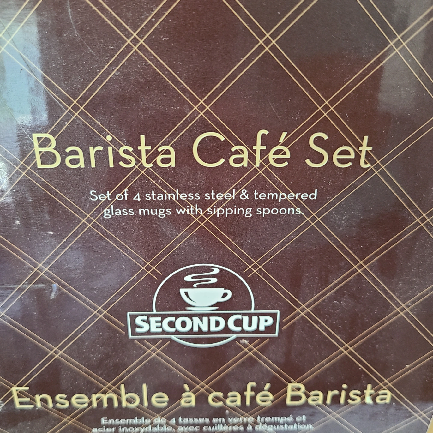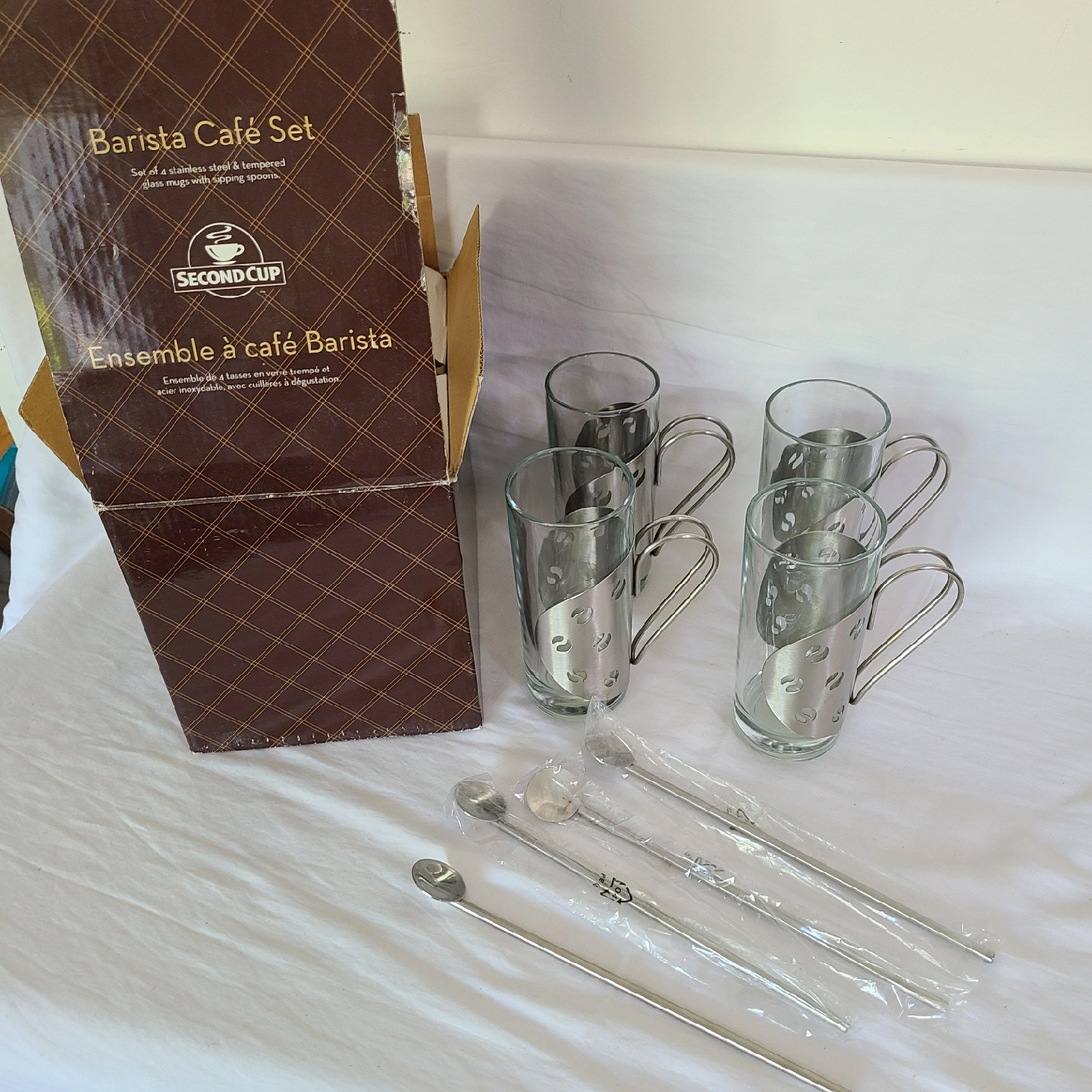 Selling a Second Cup Barista Café Set, which includes four stainless steel and tempered glass mugs with stirring spoons! This set comes in its original box and is in great condition. Perfect for enjoying your favourite hot beverages!