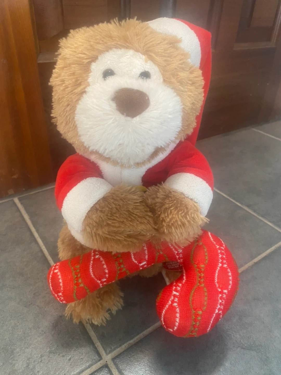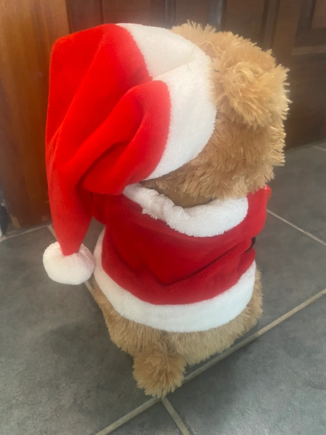 Selling a cute Sound N Light Animatronics teddy bear dressed as Santa! This adorable bear is perfect for the holidays and would make a great addition to your festive decorations. The bear plays Under the Mistletoe by Justin Bieber and moves his head and arms. There is a slight noise from the motor when in motion