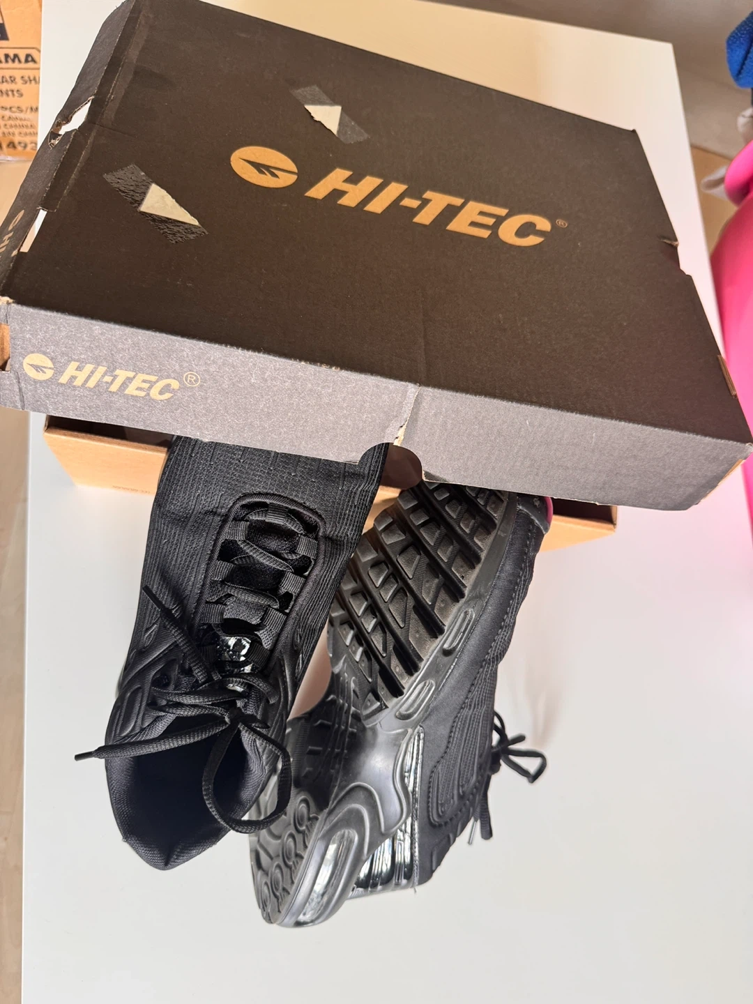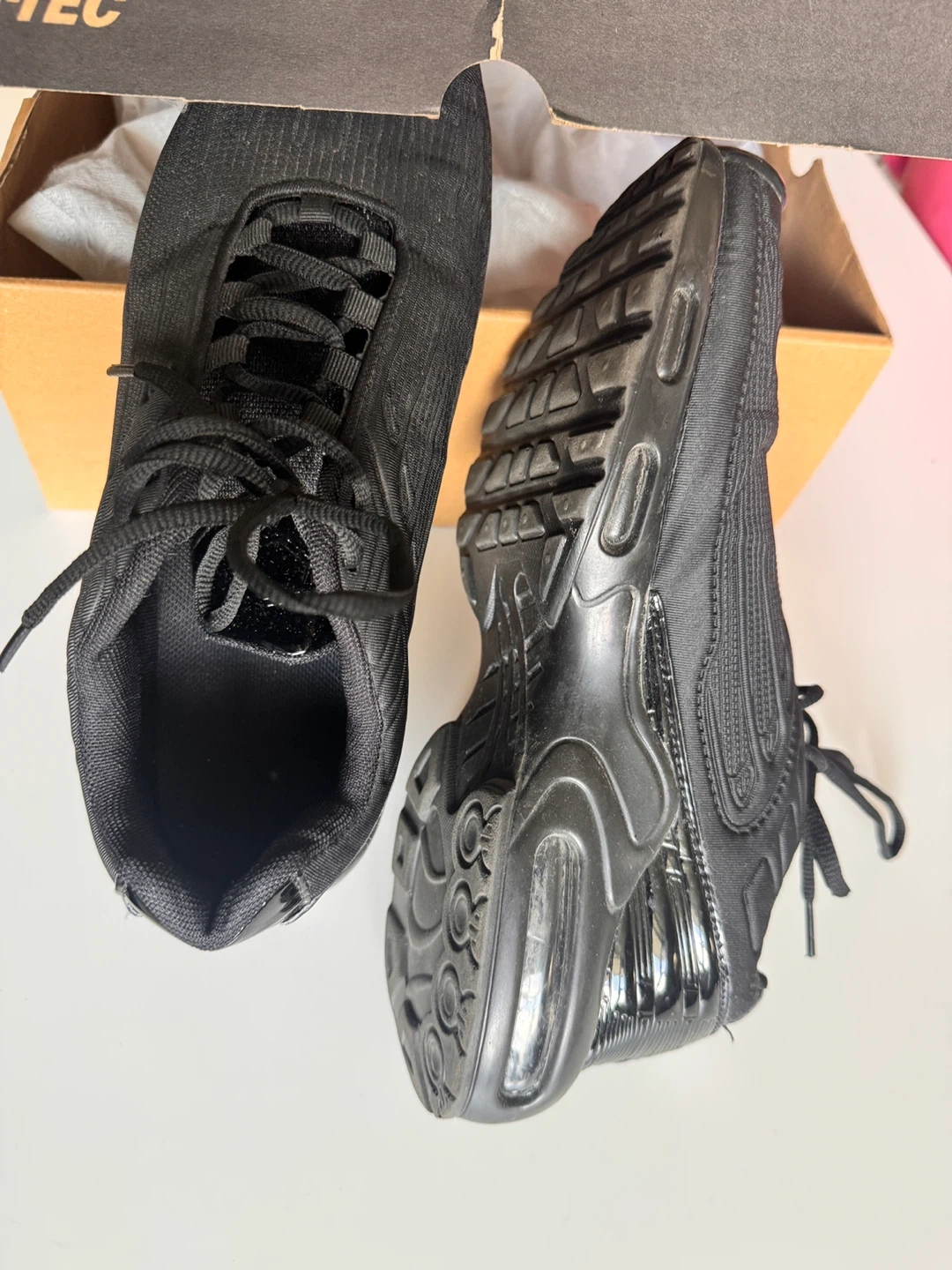 Selling a pair of sneakers in black. They come with the box. Great for everyday wear or hitting the trails! The size is 8.5.