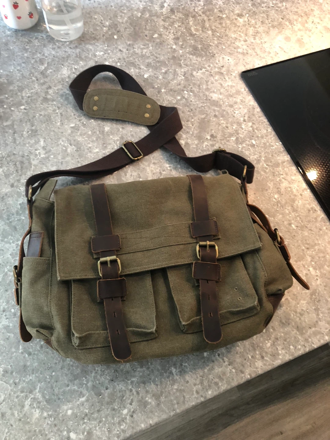 Selling a sturdy canvas and leather messenger bag in new condition! It's a versatile bag with a classic look, perfect for carrying books, a laptop, or everyday essentials. The canvas material is durable and the leather accents add a touch of style. Lots of pockets for organization too!