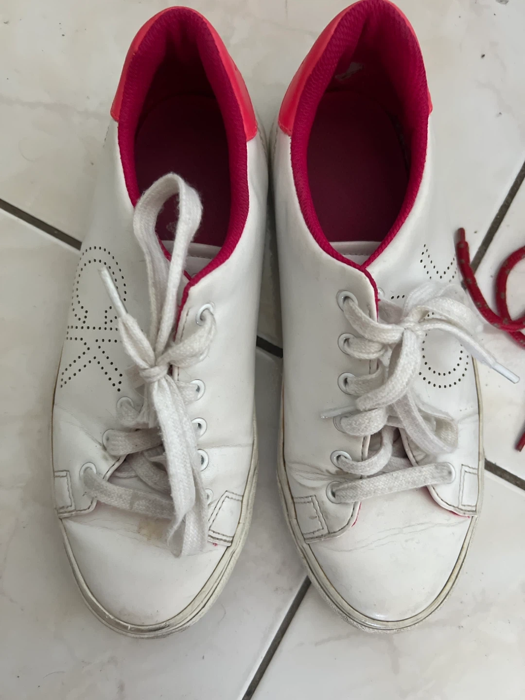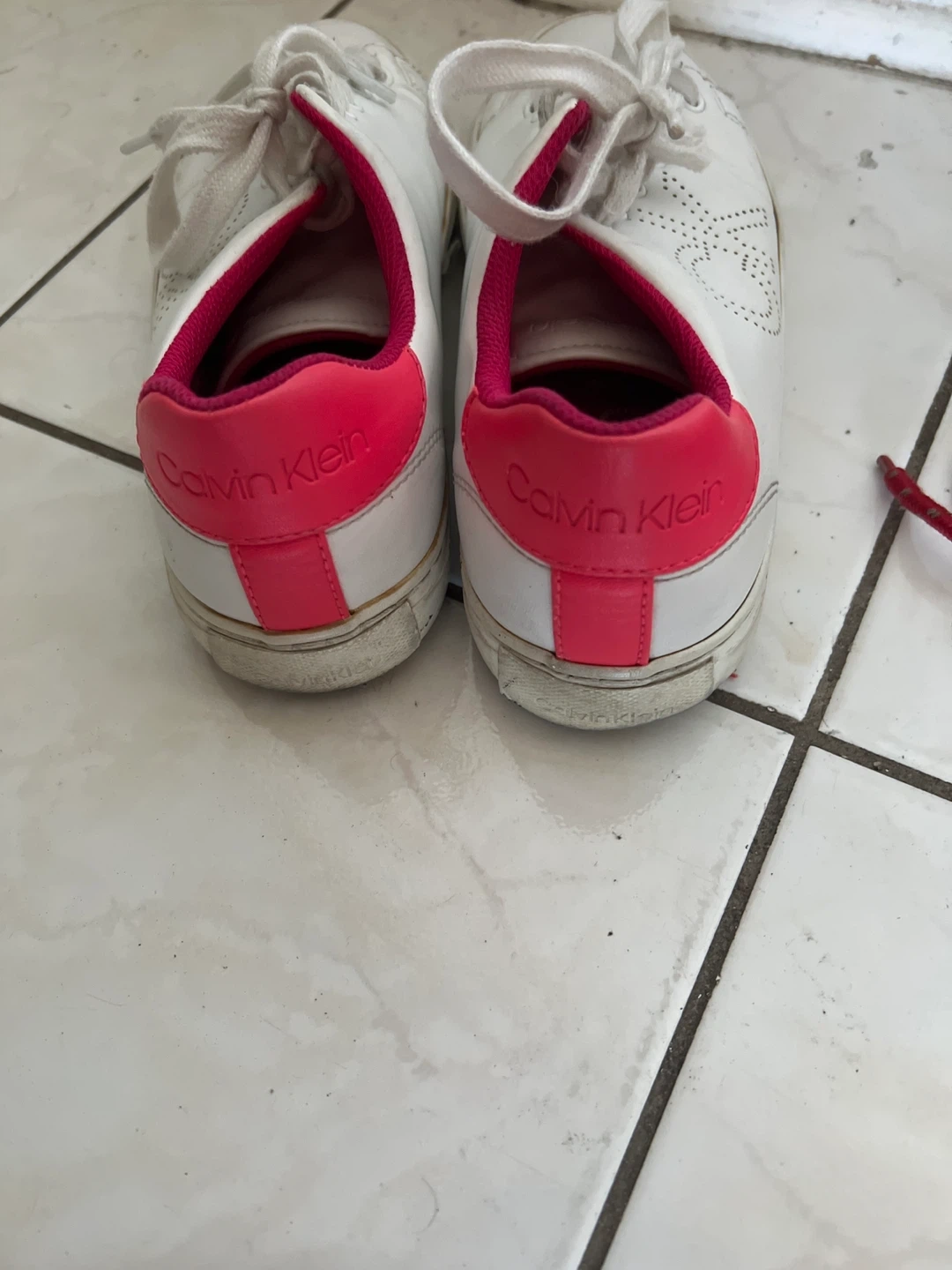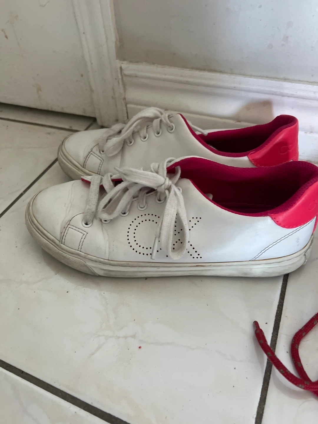 Selling a pair of Calvin Klein sneakers! They are white with pink accents. They show some signs of wear, but still have lots of life left