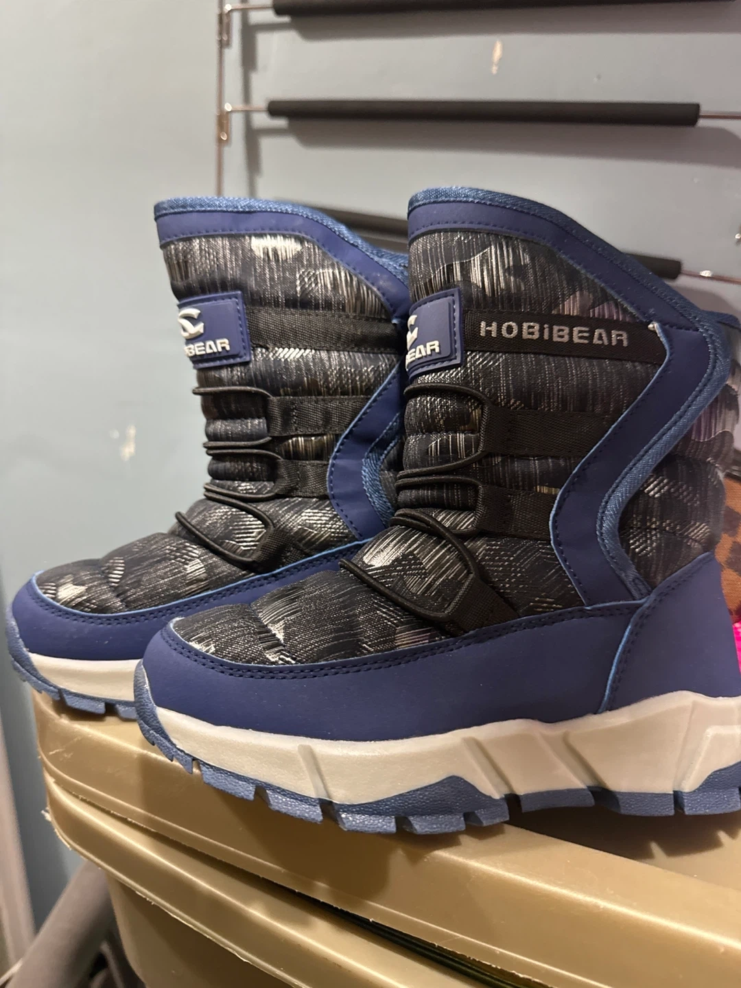 Hobibear winter boots in size 205(2). They're blue and black with a white, furry lining. The soles have a good grip, perfect for winter weather! They're in good condition and ready for some snowy adventures