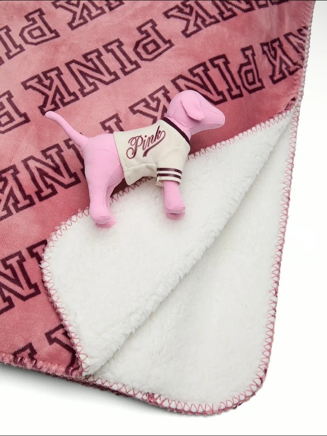 Selling a brand new Victoria's Secret PINK blanket, still sealed in its original packaging! It's a soft, plush blanket with the PINK logo all over, perfect for cozying up. The blanket is a lovely mauve colour with a white sherpa lining. Great for adding a touch of PINK to your space!