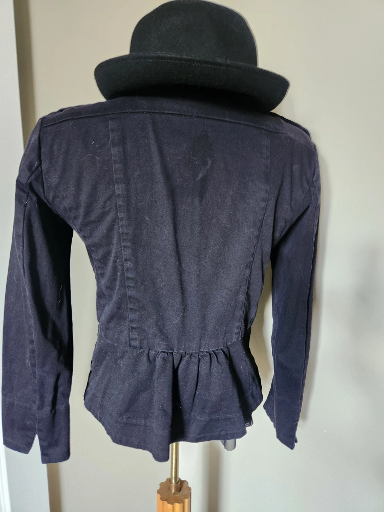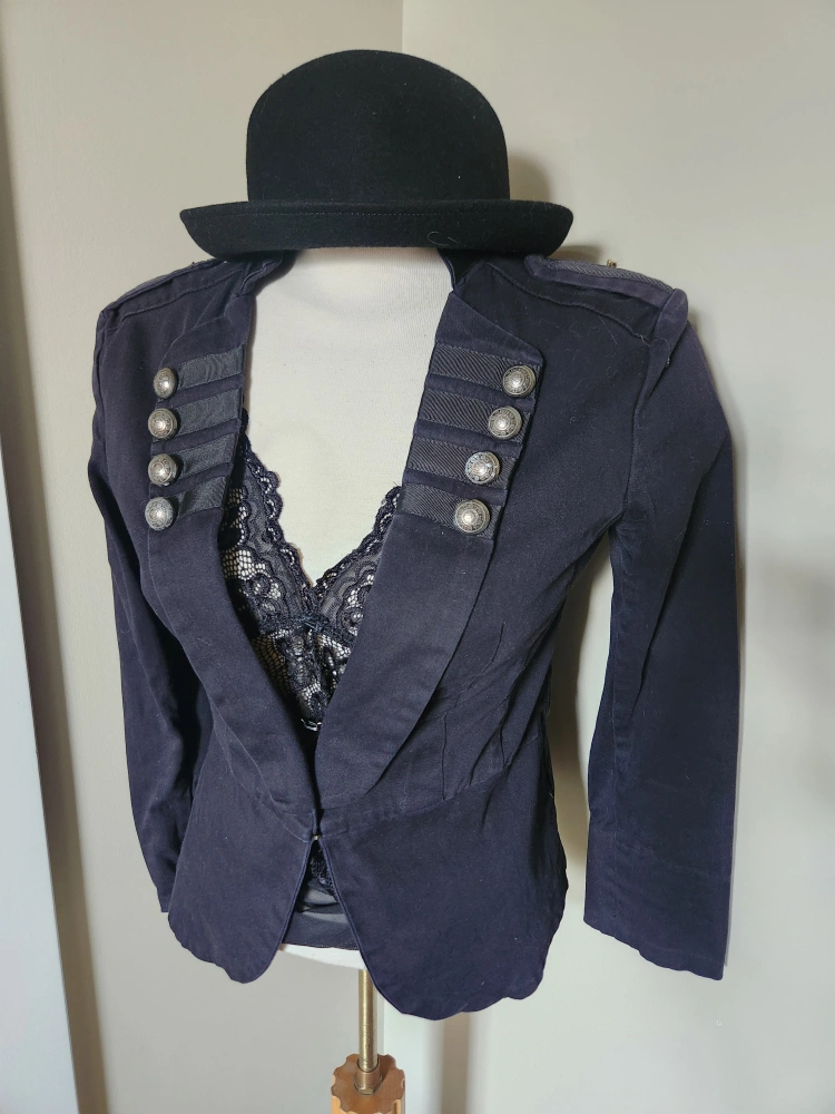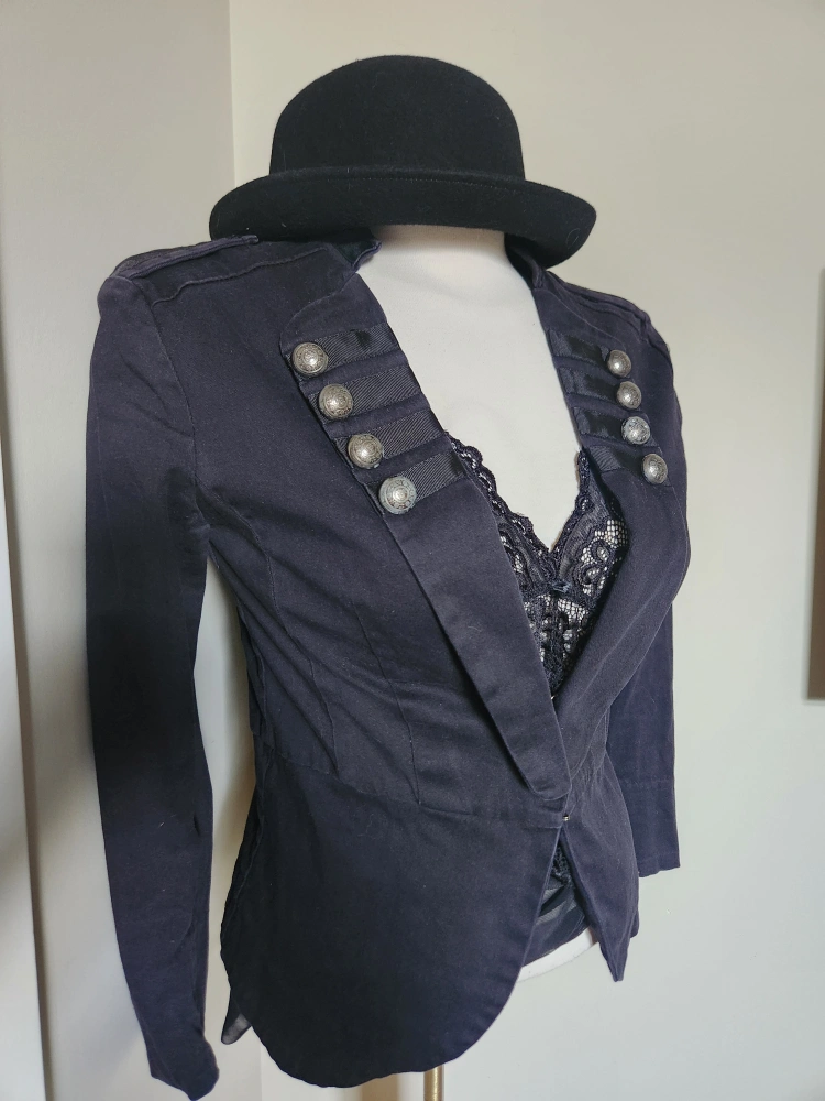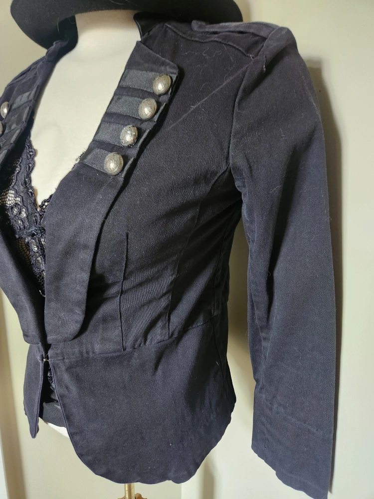 Selling a stylish black military-style jacket. It features decorative silver buttons and a unique design. This jacket is perfect for adding a touch of edginess to your wardrobe! size small fits size 4 to 6