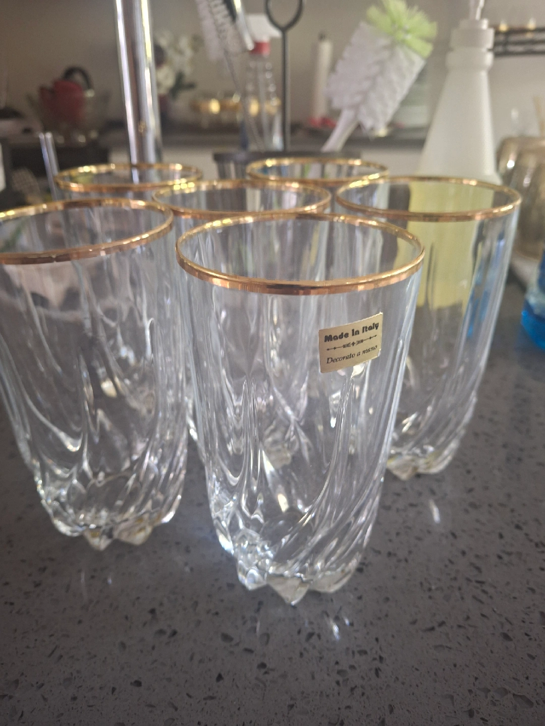 Selling a set of 6 beautiful glasses. They are made in Italy and feature a lovely gold rim. The glasses have a decorative, textured design.