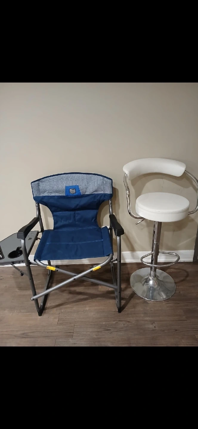 Selling a folding camping chair by Woods. It's in great shape and super convenient for outdoor adventures. It even has a built-in side table for your drinks and snacks!