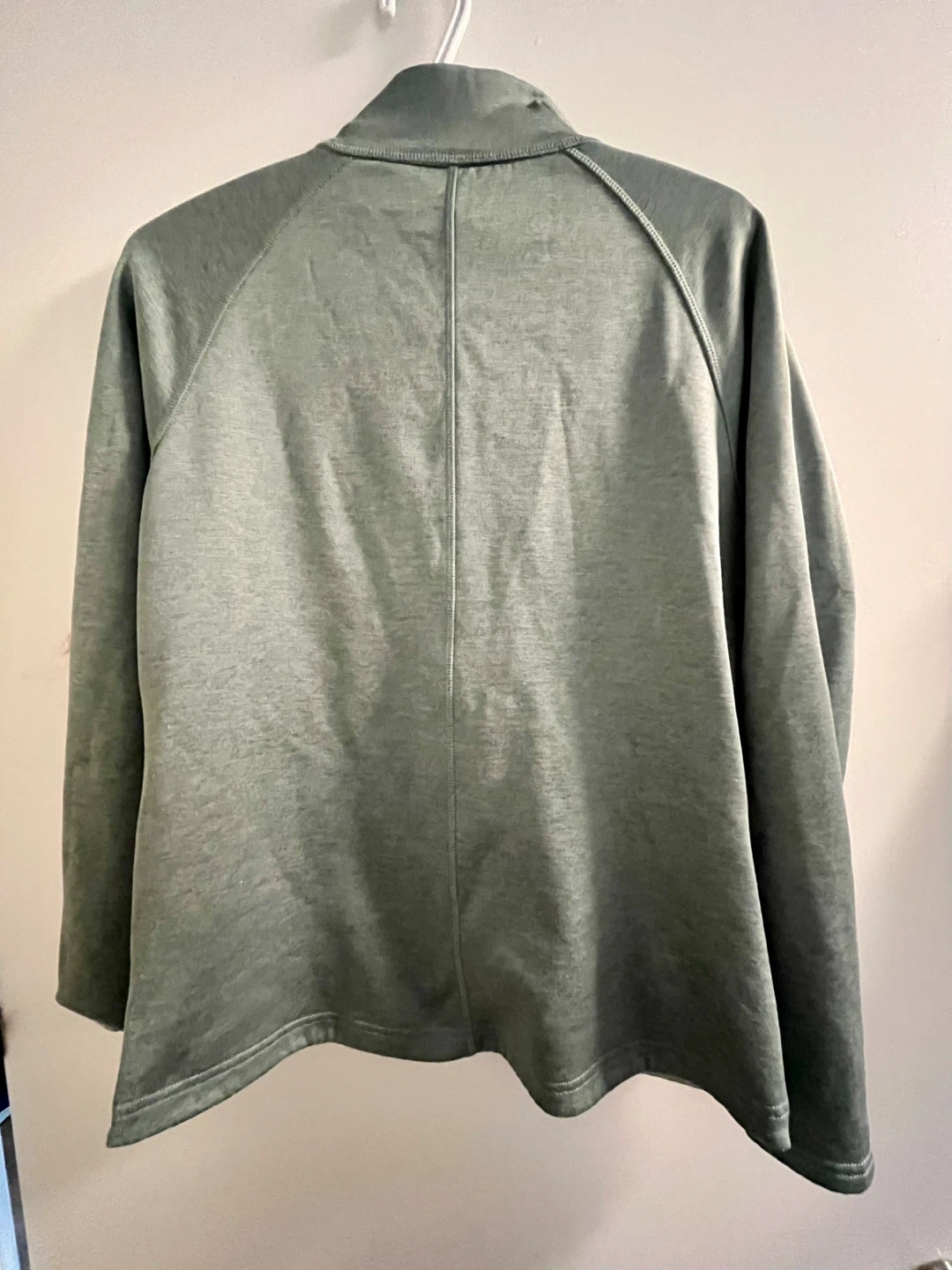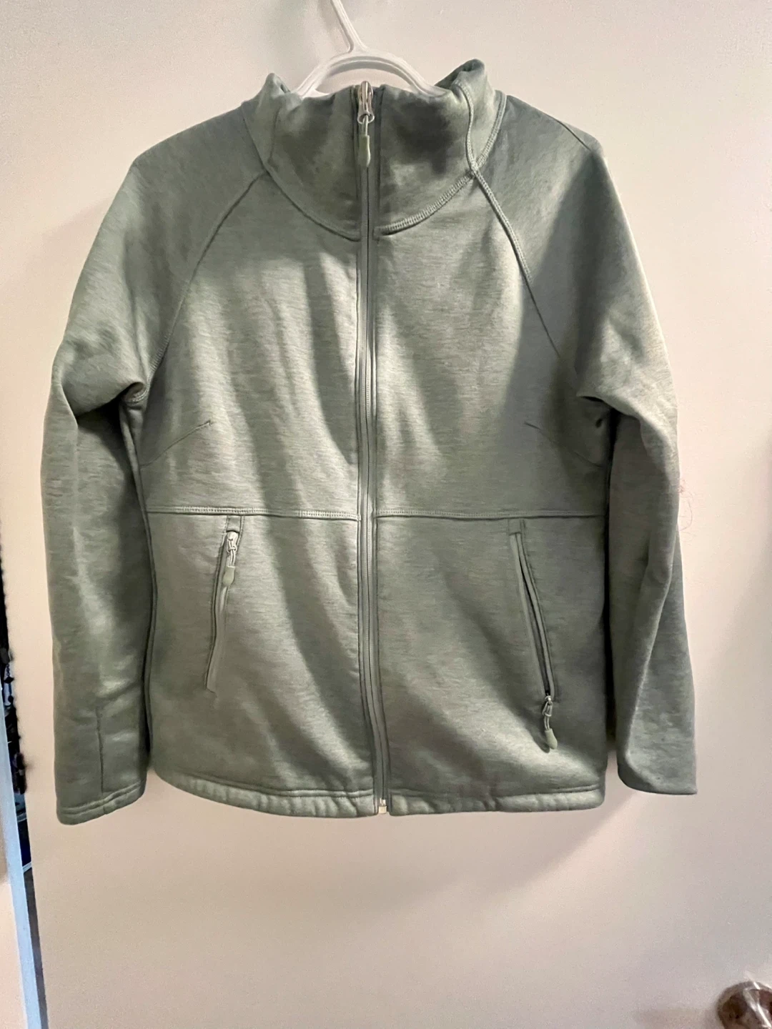 Here's a Kirkland Signature fleece jacket in a lovely sage green colour! It's a size small (S). Perfect for layering or wearing on its own on cooler days. It has a full zipper and handy pockets!