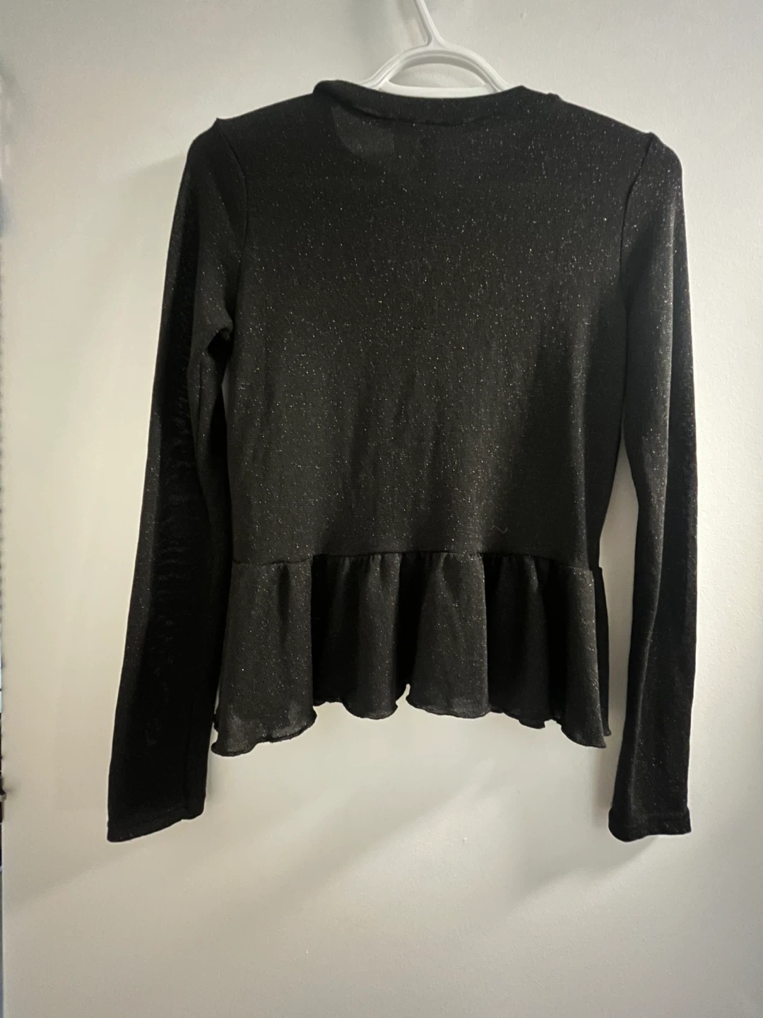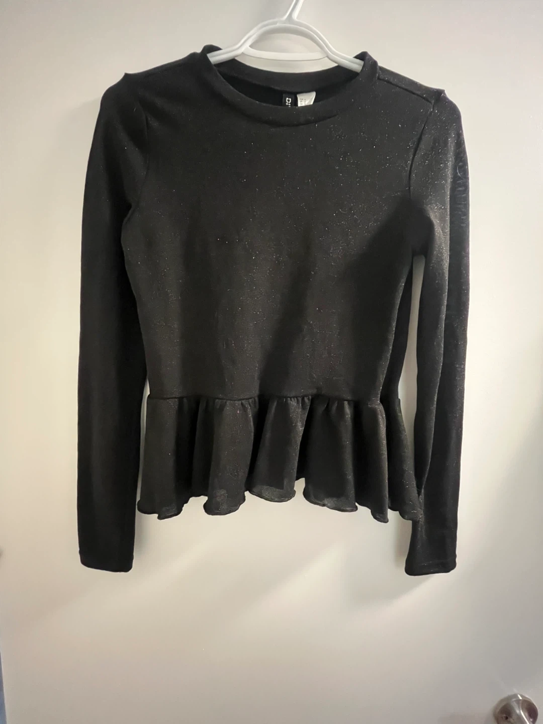 Selling a cute black peplum top from H&M's Divided line! It's a size small and has long sleeves. The fabric has a subtle sparkle, making it perfect for dressing up or down. In great condition! Pickup downtown and cash only!