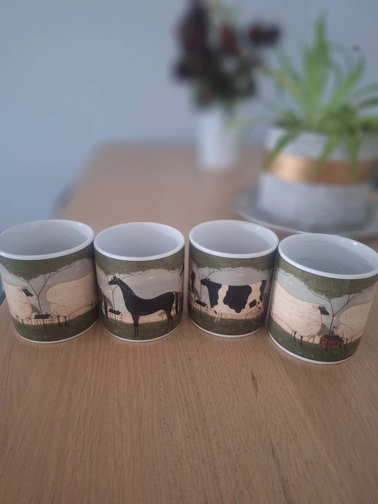 Selling a set of four mugs featuring charming farm animal designs! Each mug has a different animal: a sheep, a horse, and a cow.
