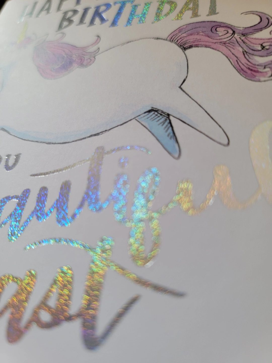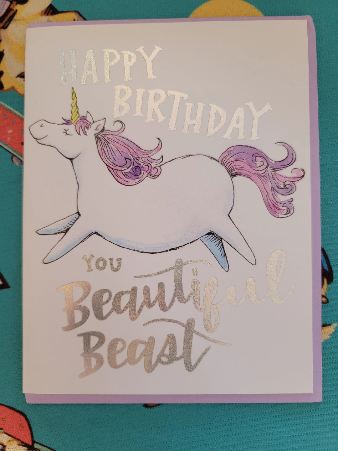 A cute Happy Birthday card from Paper Wilderness! Features a unicorn and the words "Happy Birthday You Beautiful Beast" in silver-rainbow irridescent foil. Comes with a lavender envelope. Blank Inside. Open to negotiating the price; please reach out. Thank you for taking a look at my listing! Have a wonderful day.