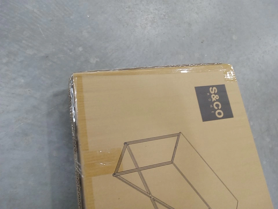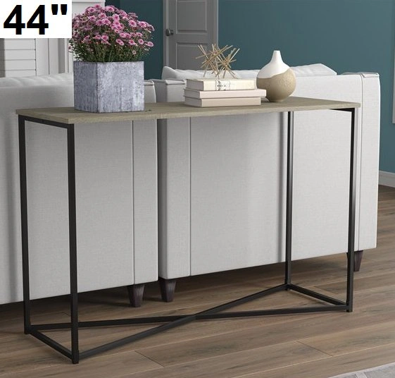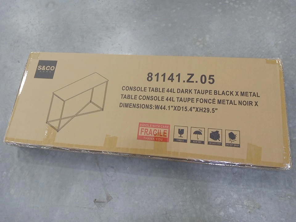 This brand new s&co. entryway console table features a sleek dark taupe top and a modern black metal frame, perfect for adding a touch of elegance to your entryway or living space. The dimensions are 44.1" x 15.4" x 29.5".