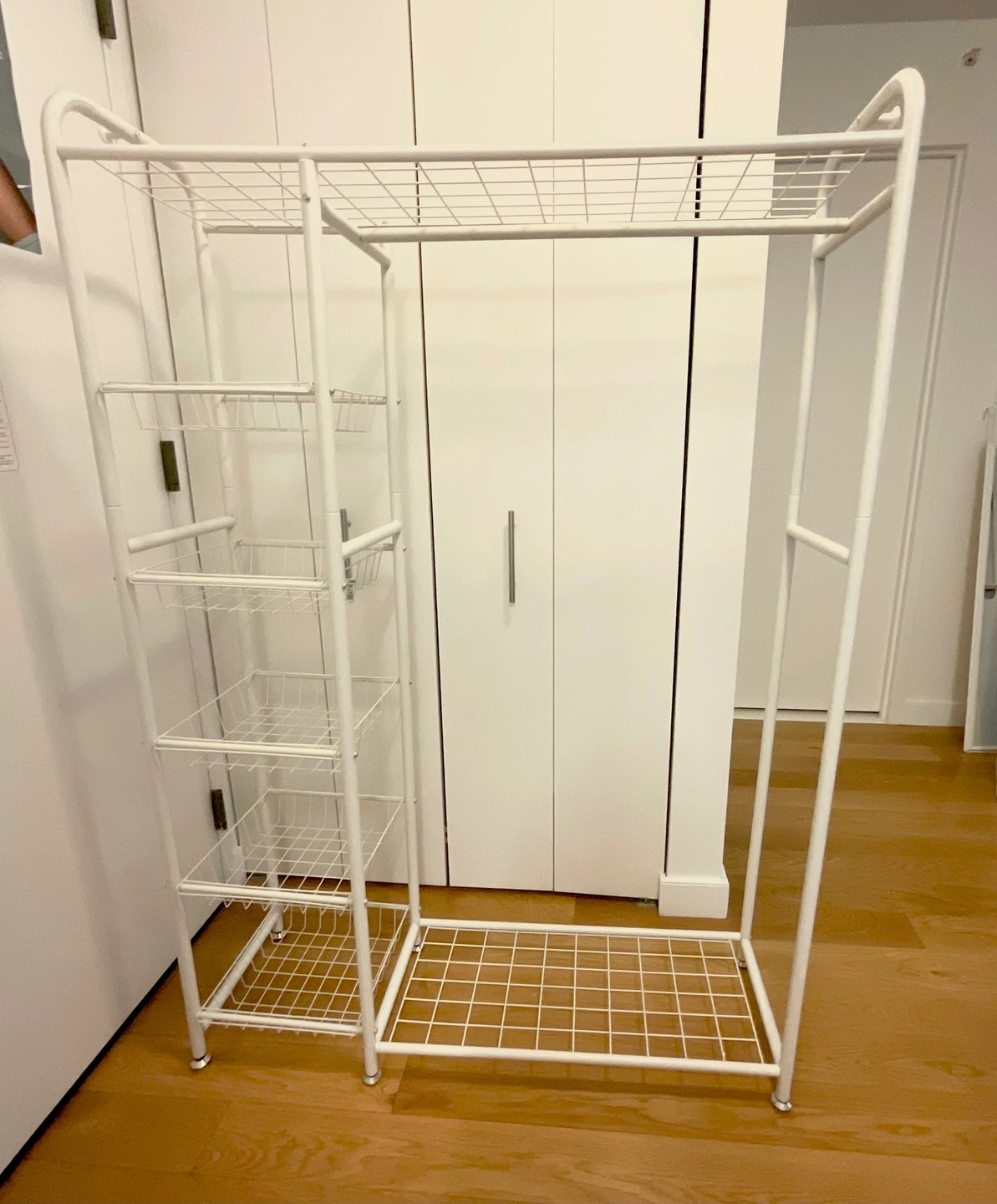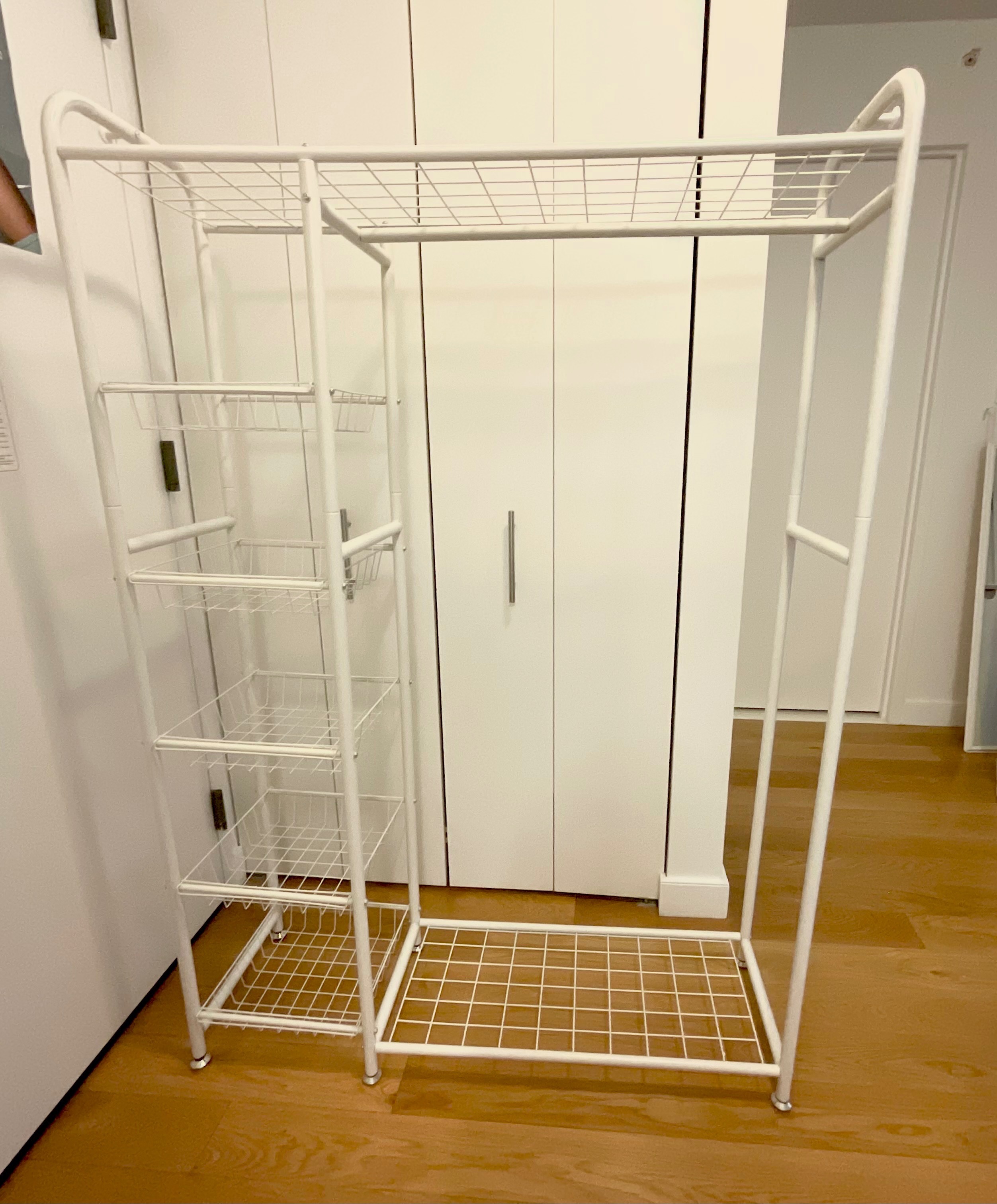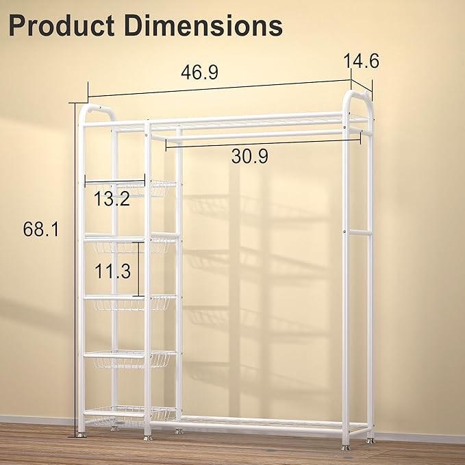 RISTERN White Metal Garment/Wardrobe Rack with 5 removable storage baskets, plus upper and lower storage.