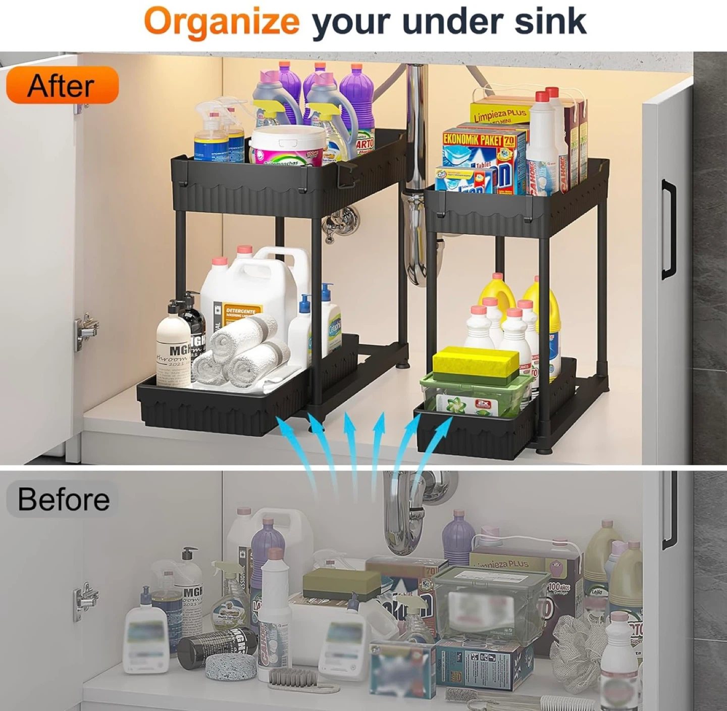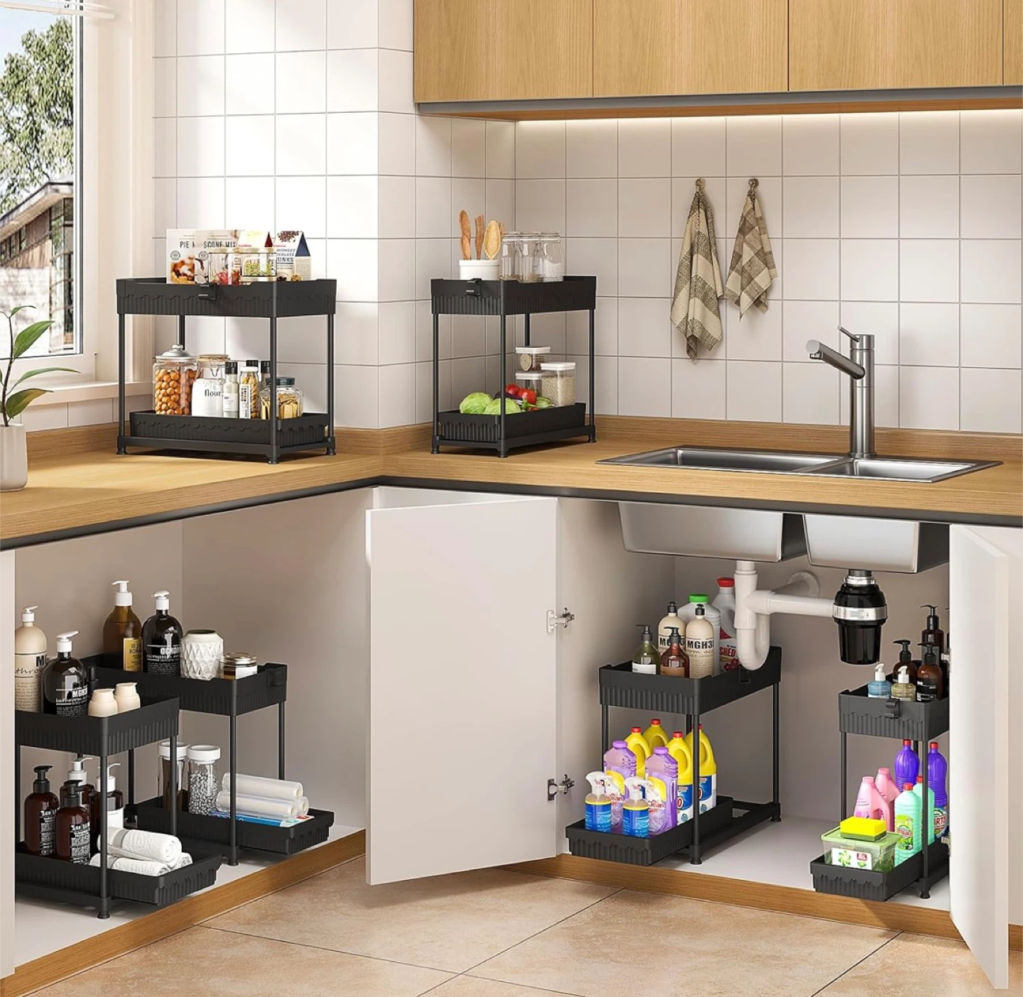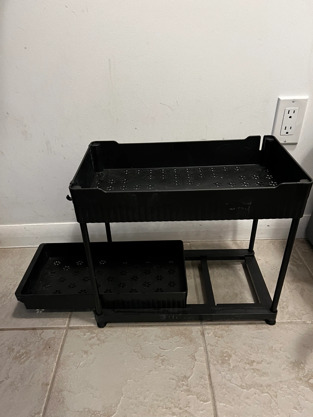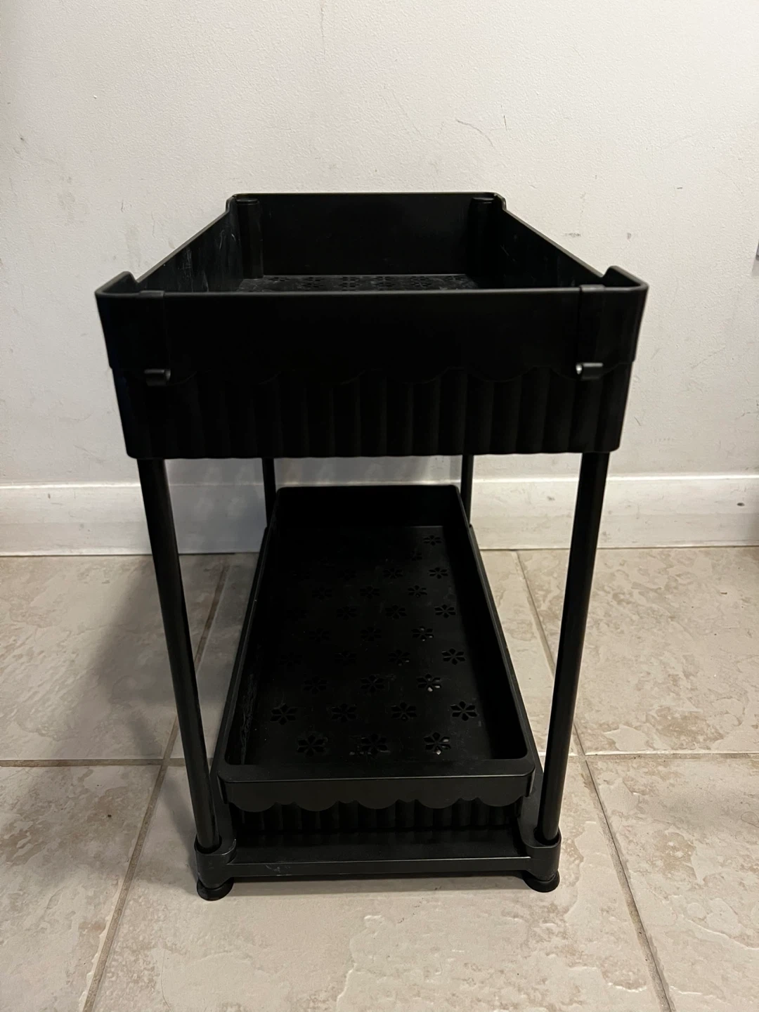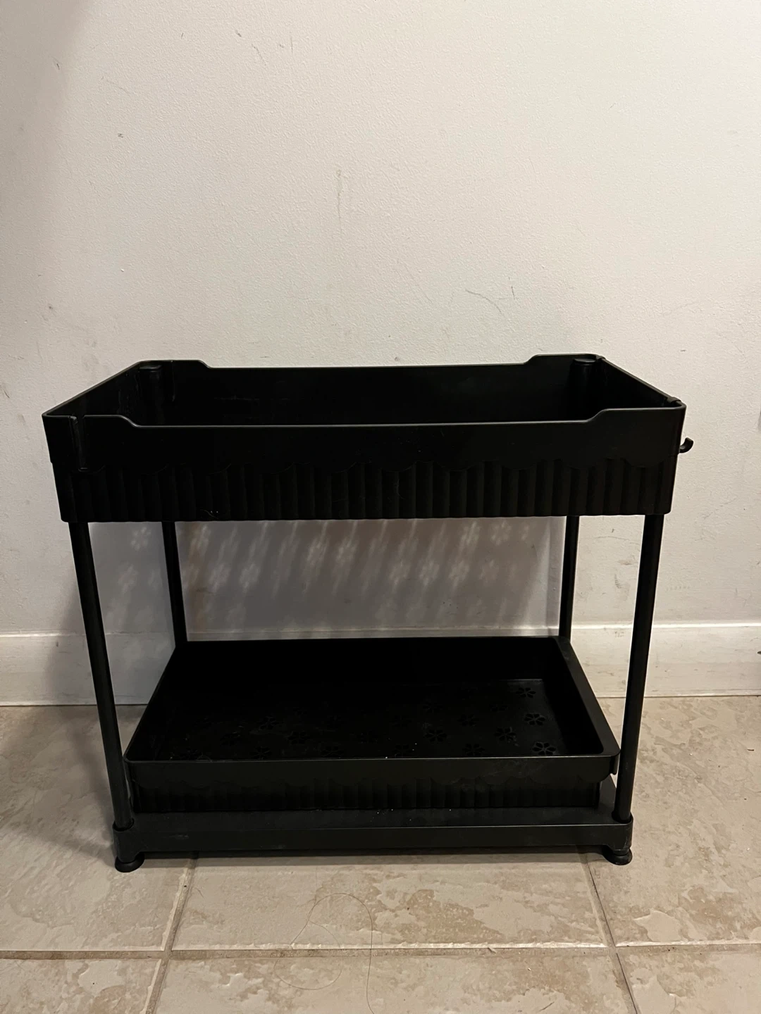 Selling 2 Two-tier rolling cart in great condition! Perfect for extra storage in the kitchen, bathroom, or anywhere you need a little more space. It's black plastic and easy to move around.