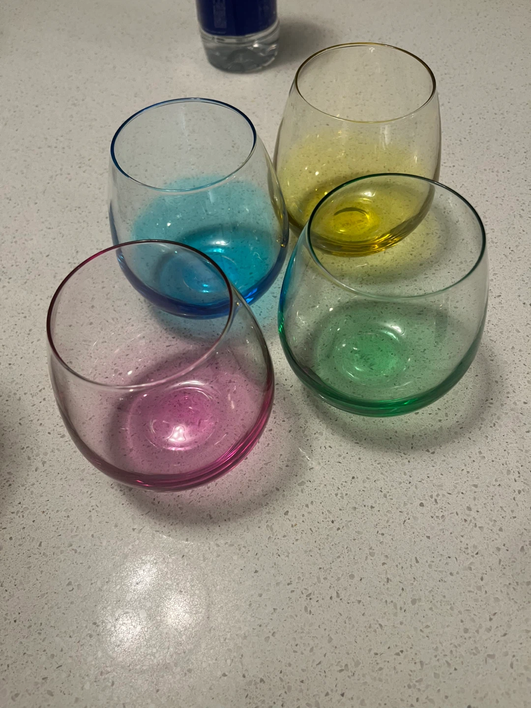 Selling a set of four stemless wine glasses in excellent condition! The set includes one glass each in pink, blue, yellow, and green. Perfect for adding a pop of colour to your next gathering