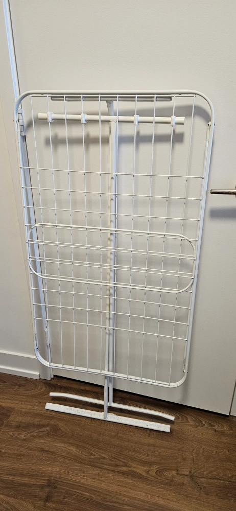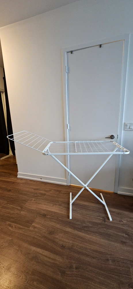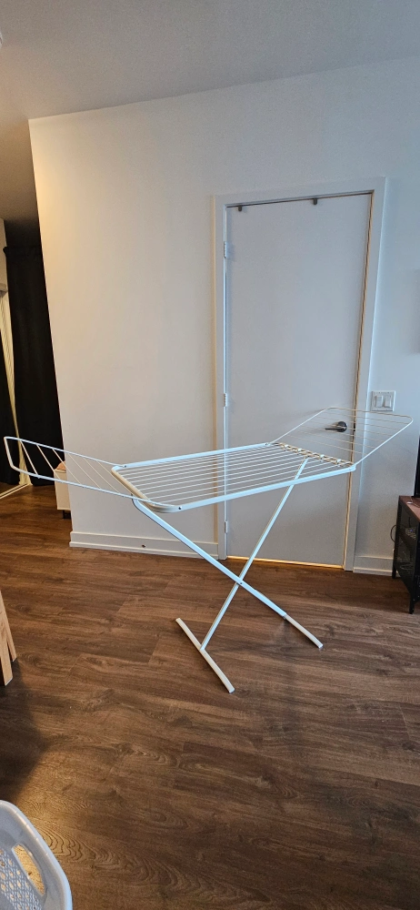 Selling a white metal folding clothes drying rack. It's in great shape and perfect for small spaces! It folds up easily for storage when not in use. Great for air-drying clothes indoors!