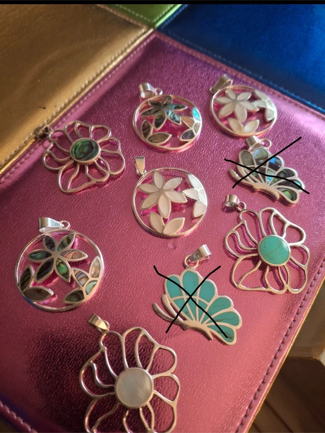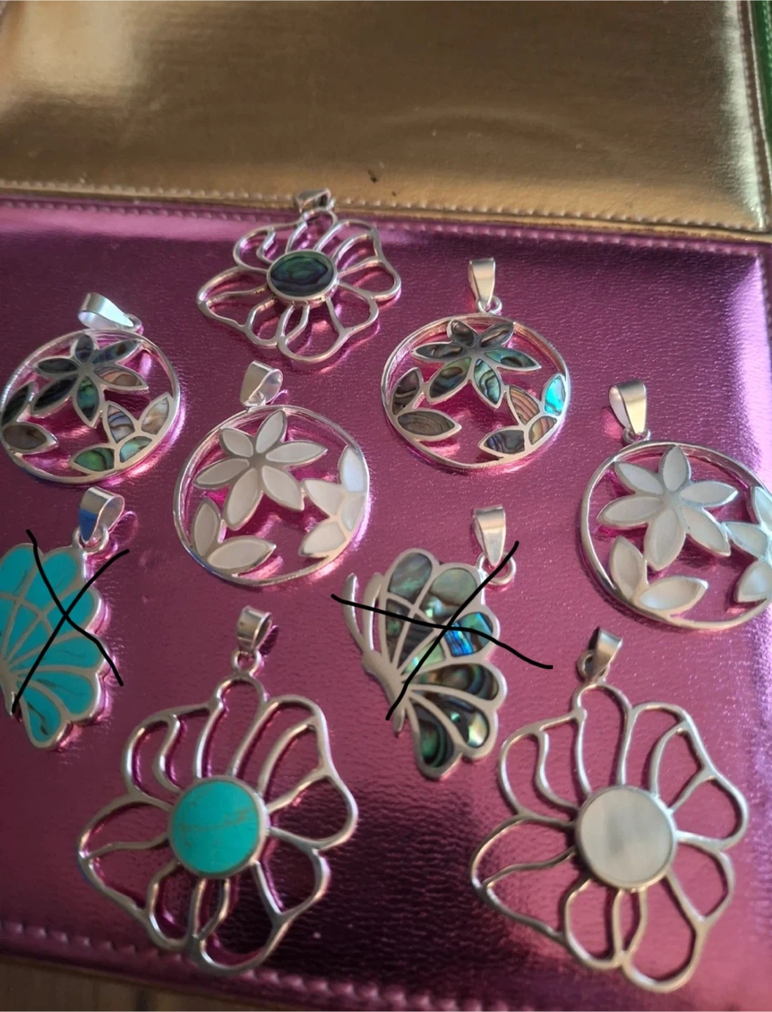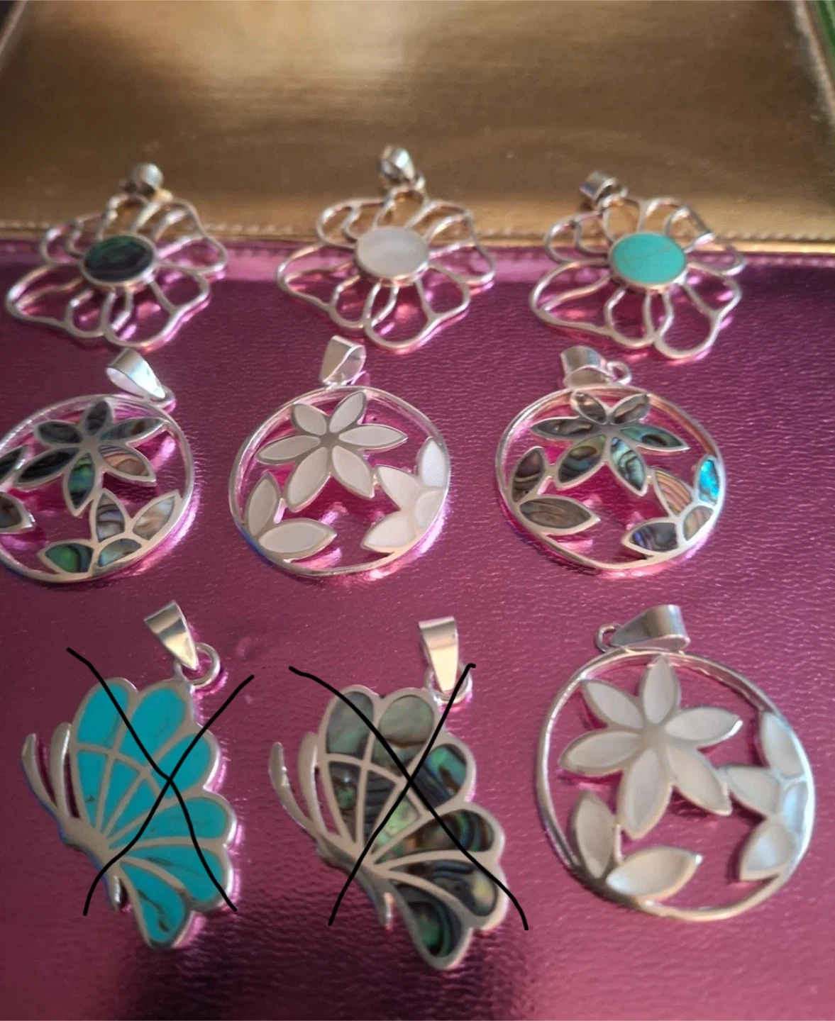 A variety of pendants available in different styles and colours. Never been worn. -Large flowers, stamped 925 silver ($15 each) -Circle with 3 flowers, stamped 925 silver ($15 each) -Butterflies have sold, no longer available Pendants only (no chains) Available for pickup in Markland Wood.