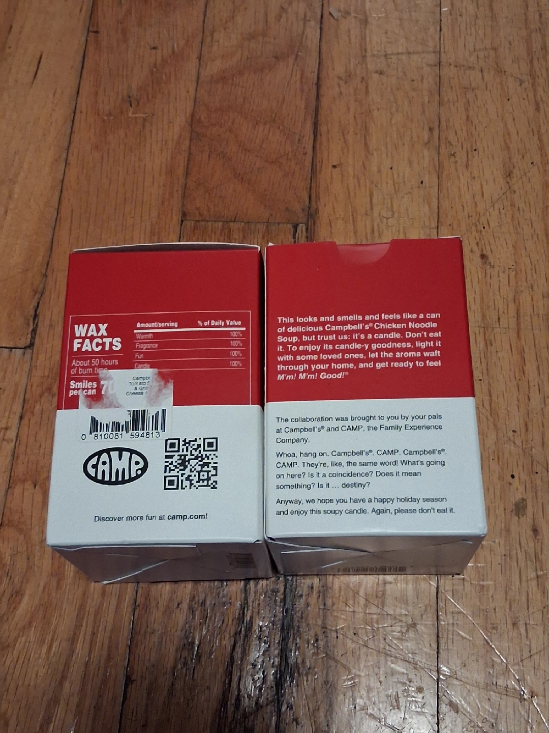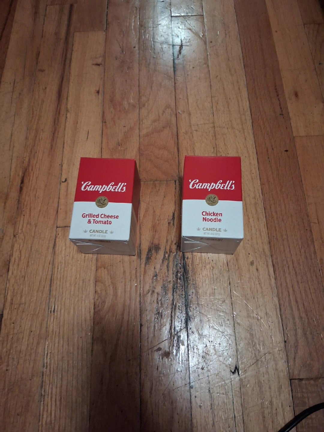 Selling a set of Campbell's soup-scented candles! One is Chicken Noodle and the other is Grilled Cheese & Tomato. These smell like a can of delicious Campbell's soup. They each have a net weight of 8 oz (227g). These candles burn for about 50 hours and smell like smiles!