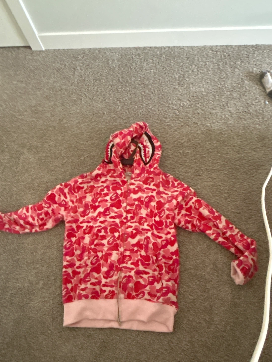 Selling a gently used Bathing Ape (BAPE) hoodie in a pink camo print! It's in great condition and perfect for adding a pop of colour to your wardrobe. The iconic BAPE shark design is featured on the hood. A super cool and stylish piece!