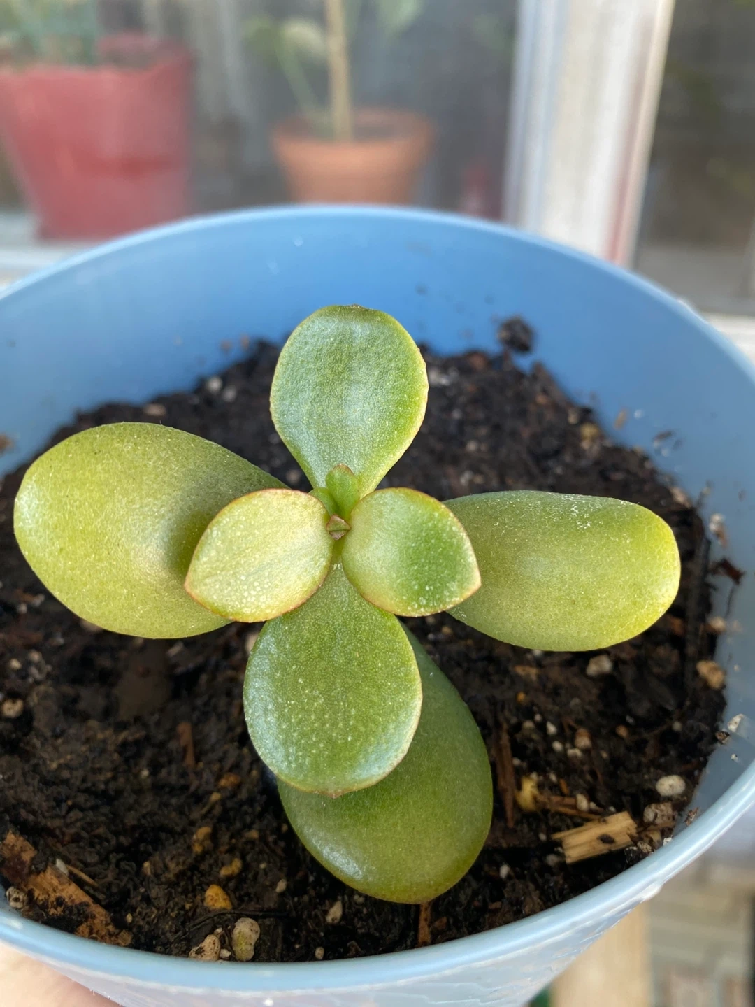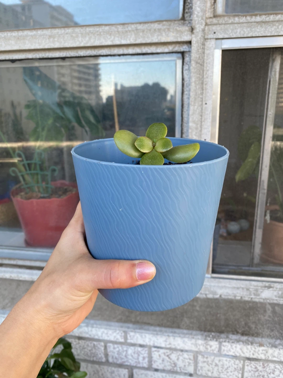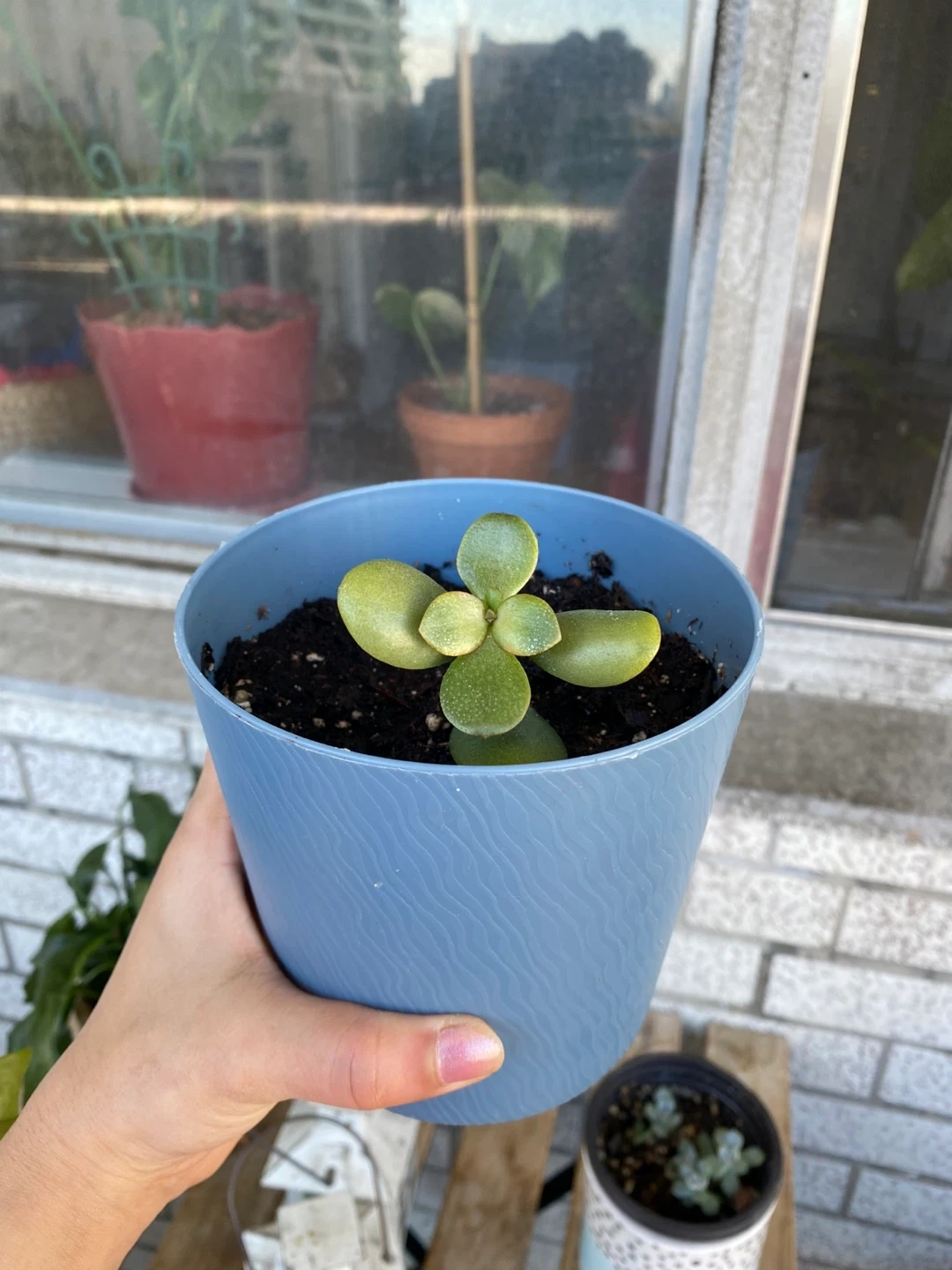 I'm selling a cute little jade plant! It comes in a nice blue pot and is ready to brighten up your space. It's a low-maintenance plant, perfect for beginners