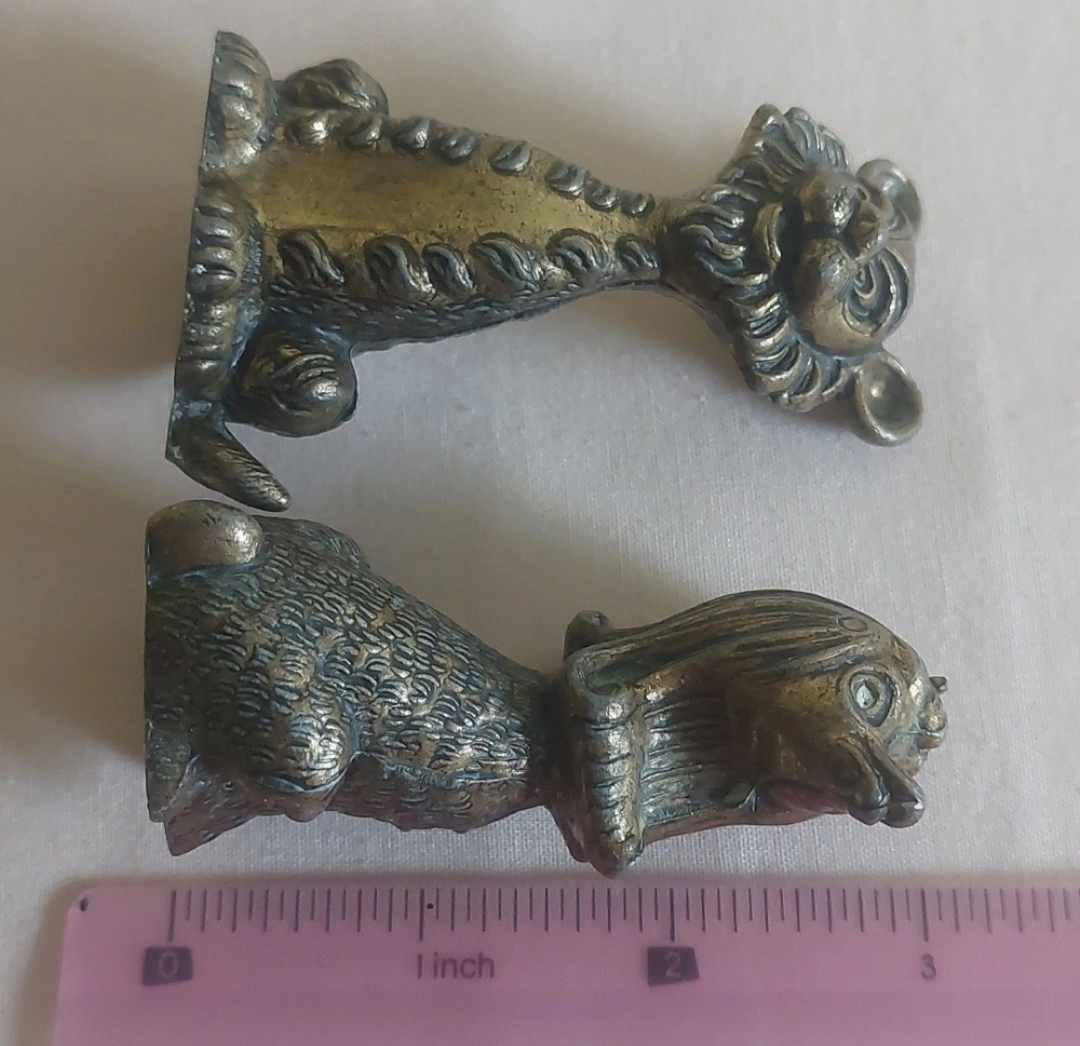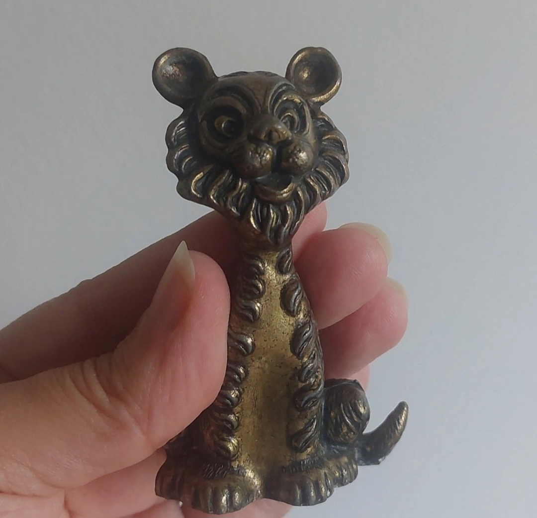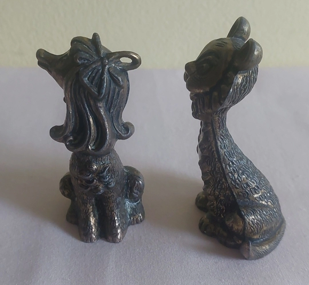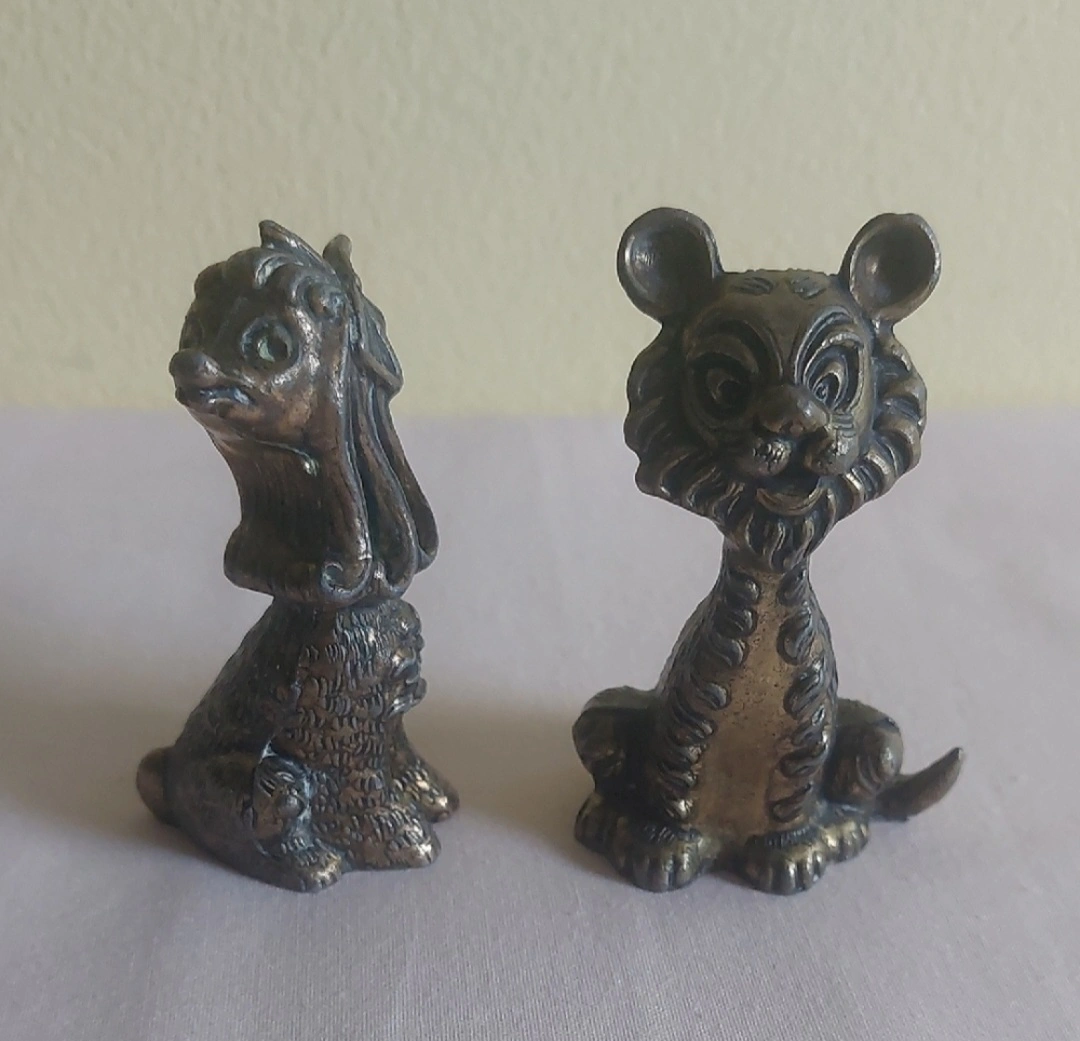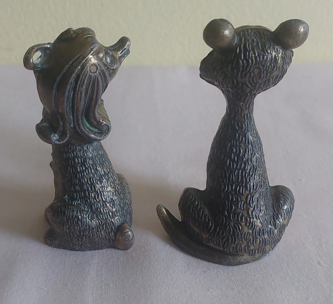 Charming metal brass animal figurines of a cat and dog. Measuring 3". Made in Italy.