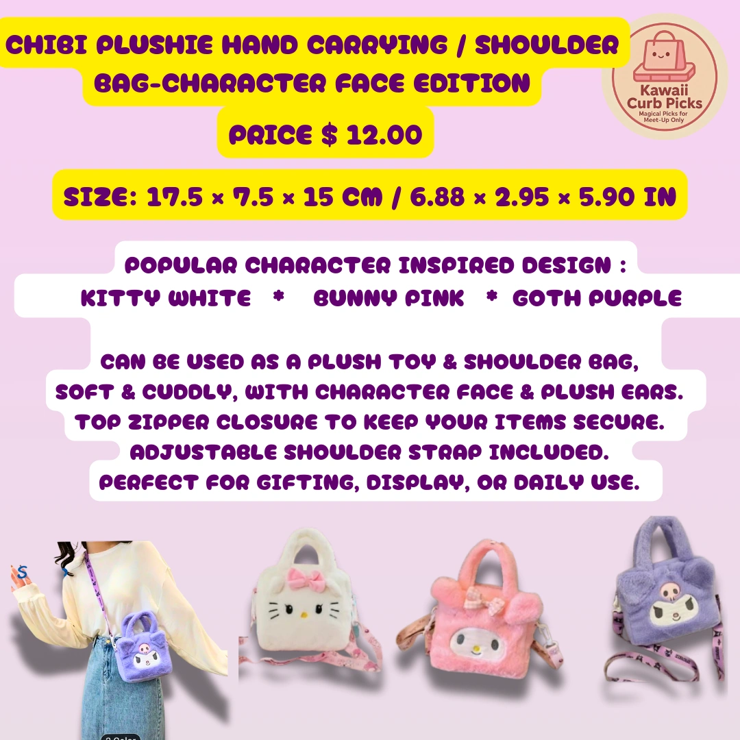 Super cute chibi plushie hand carrying/shoulder bag! It's a character face edition and can be used as a plush toy or a shoulder bag. It's soft and cuddly, with character face and plush ears. Features: - Top zipper closure to keep your items secure - Adjustable shoulder strap included - Perfect for gifting, display, or daily use Size: 17.5 x 7.5 x 15 cm (6.88 x 2.95 x 5.90 in) Available in Kitty White, Bunny Pink, and Goth Purple! ONLY AVAILABLE FOR PICK UP OR MEET UP IN DURHAM CENTER AJAX. ALL ITEMS ARE HELLO KITTY AND FRIENDS CHARACTER INSPIRED.