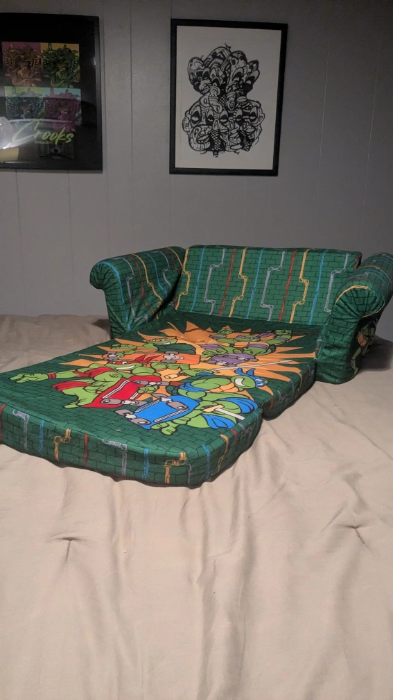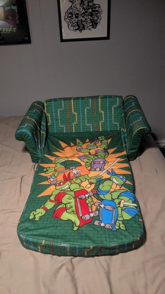 Snuggle up with this adorable Teenage Mutant Ninja Turtles flip-open sofa! It's perfect for lounging, reading, or watching your favourite TMNT episodes. The sofa easily flips open into a lounger, offering extra space for playtime or naptime. It features fun graphics of the turtles and a cool sewer-themed design. Great for any TMNT fan's room! Has been sewn around the bottom to be held together.