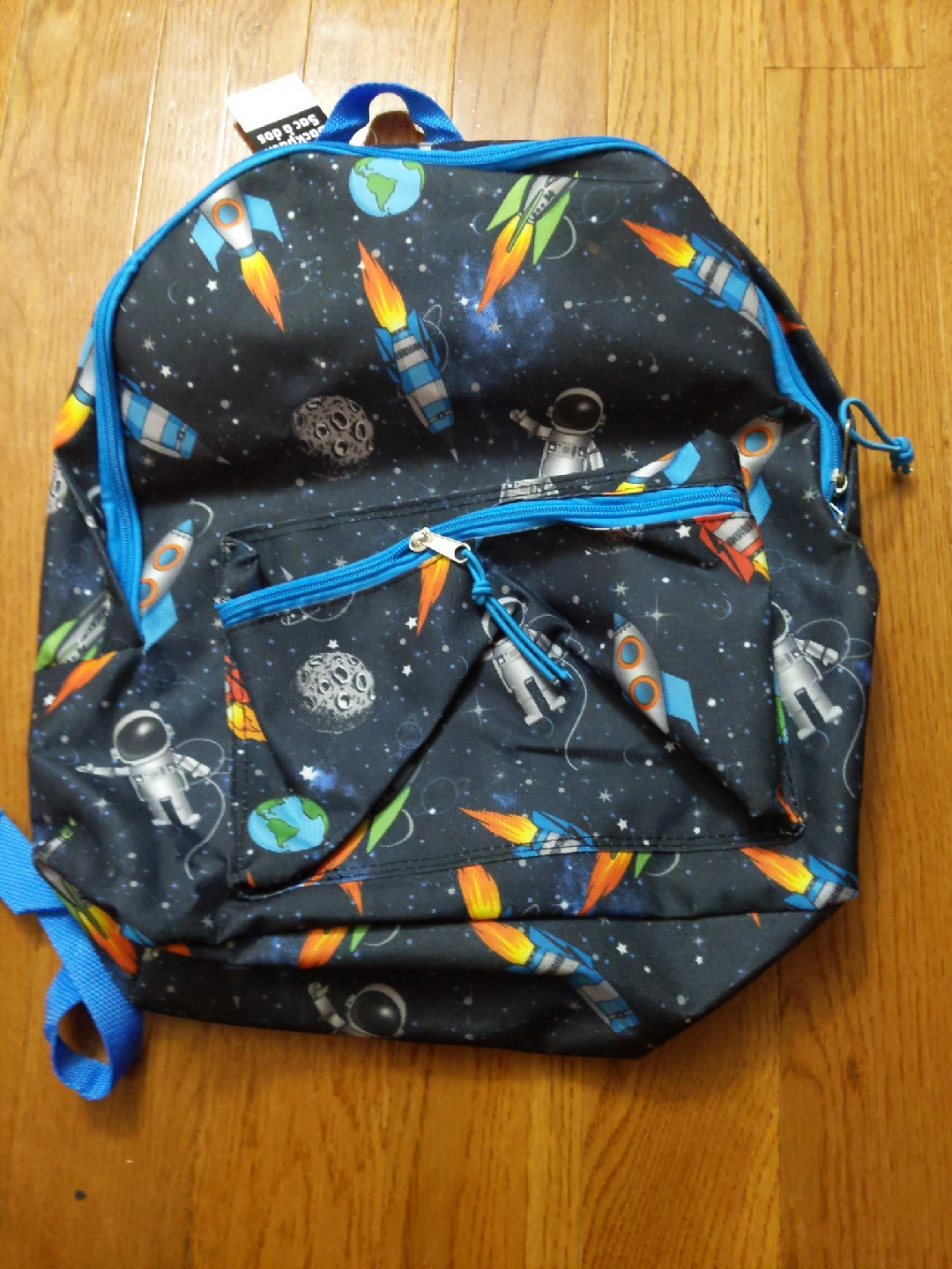 A cute space-themed backpack for kids! Features rockets, astronauts, planets, and moons on a dark blue background with bright blue trim and straps