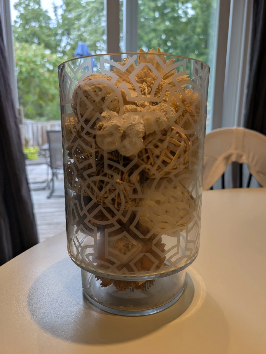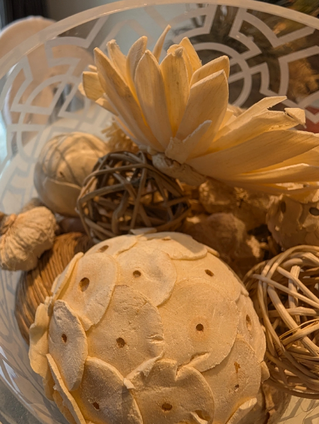 A lovely floral arrangement in a decorative glass vase! It features a mix of dried flowers and decorative balls, perfect for adding a touch of nature to your home