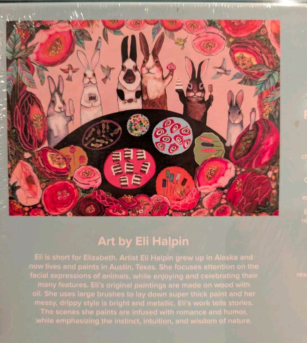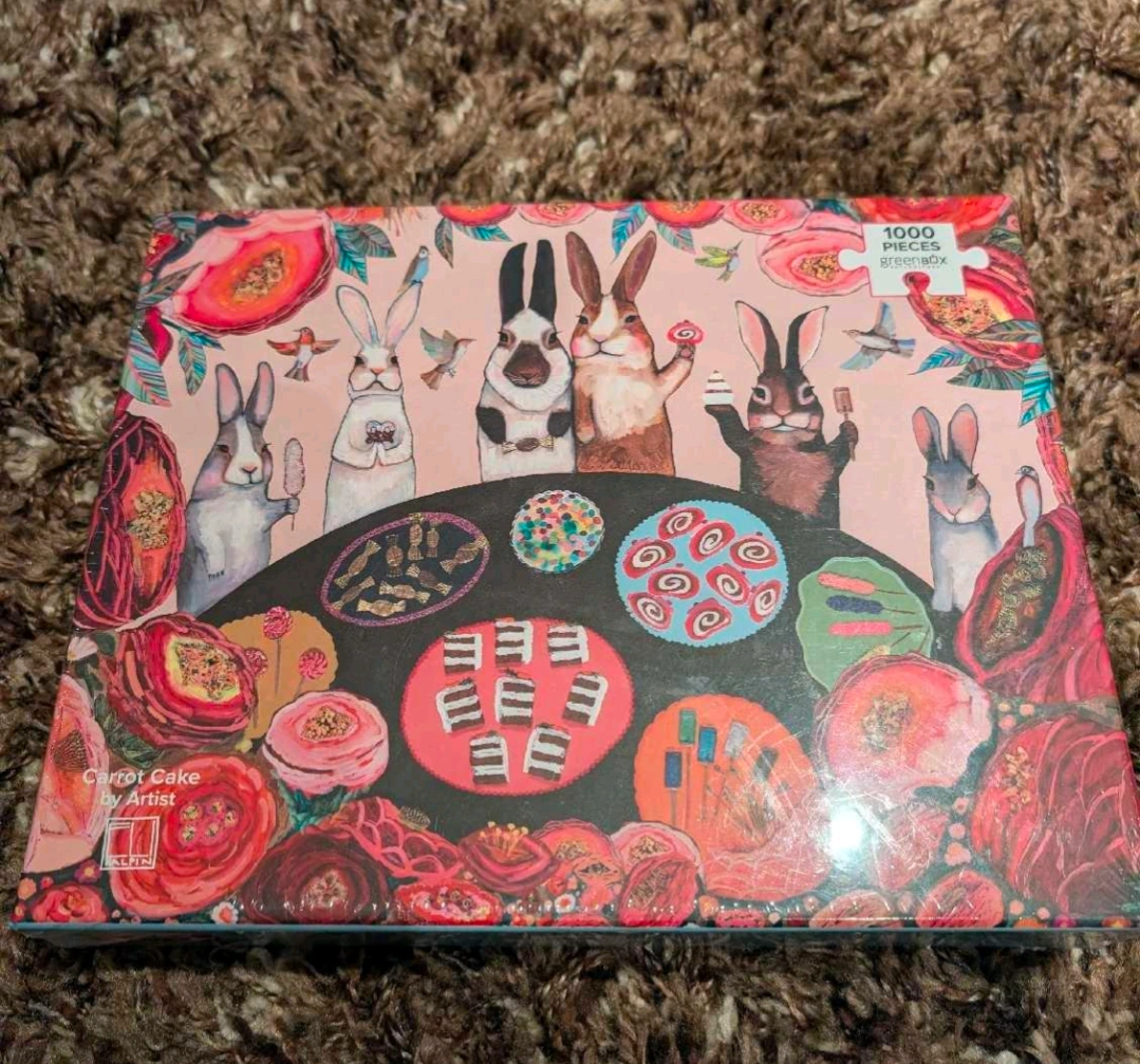 Selling a brand new, sealed GreenBox Art + Culture 'Carrot Cake' 1000-piece jigsaw puzzle! The puzzle features a whimsical design by artist Eli Halpin, with adorable bunnies and colourful carrot cake imagery.