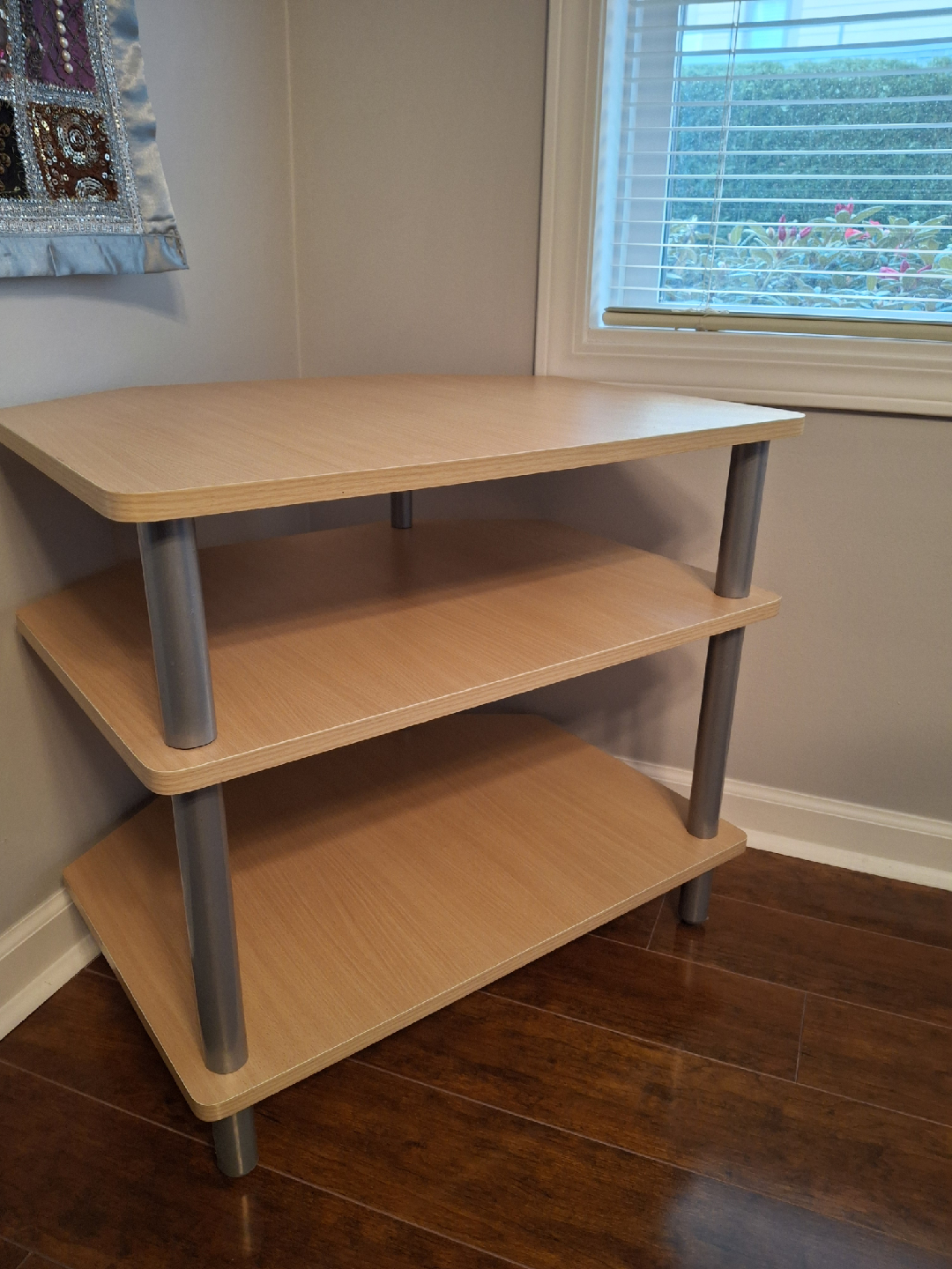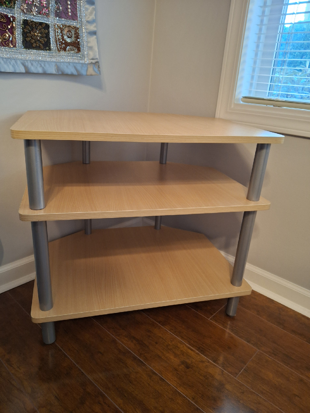 Corner shelf unit that's perfect for adding storage to a small space! It features three shelves in a light wood finish, with brushed silver supports. Great as a media stand, for plants, books, or decor. I have a free matching TV bench, if interested.