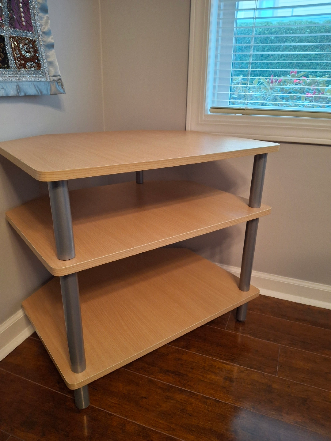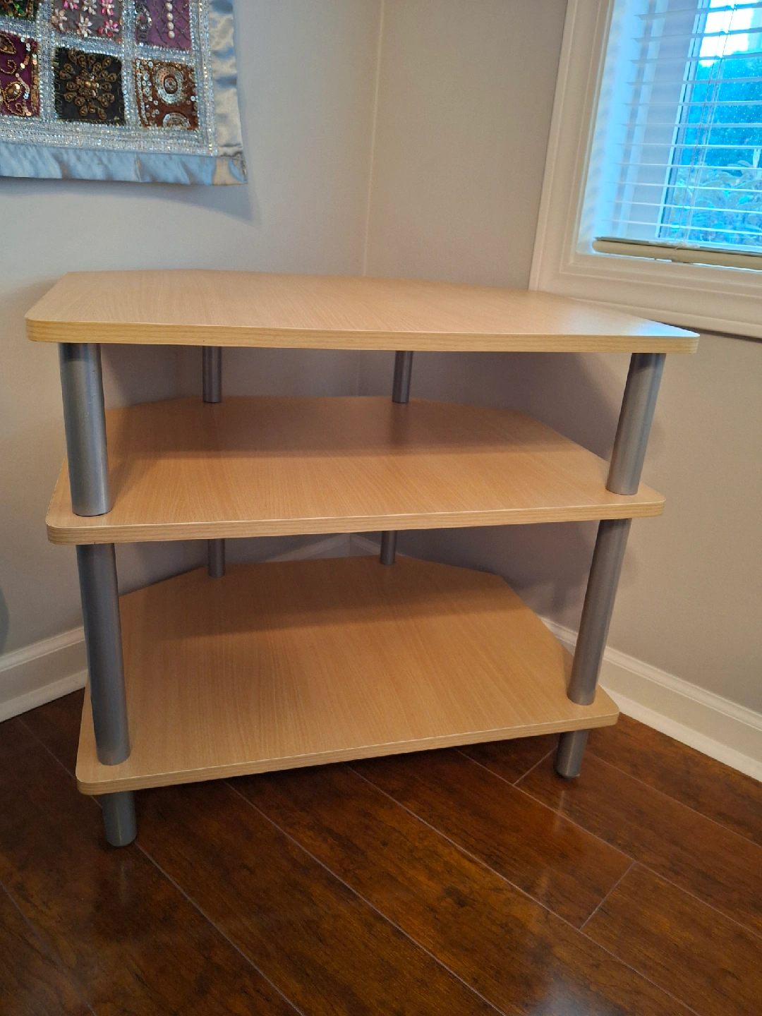Corner shelf unit that's perfect for adding storage to a small space! It features three shelves in a light wood finish, with brushed silver supports. Great as a media stand, for plants, books, or decor. I have a free matching TV bench, if interested.