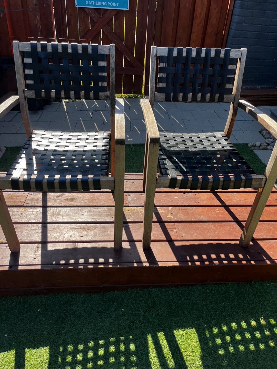 Selling a set of two outdoor chairs. They have a lovely wooden frame with woven black straps for the seat and back. Possibly teak or acacia wood. Measures at 22”W x 20”D x 17.5” seat height x 34” back height.