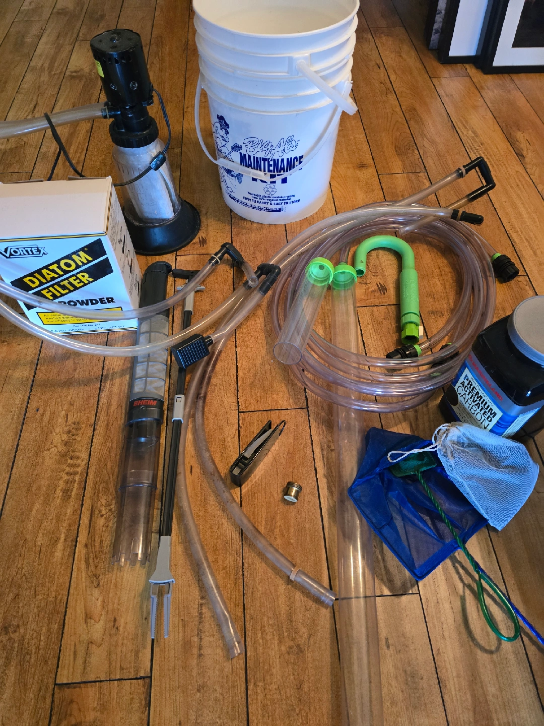 Selling a complete aquarium cleaning and maintenance kit! It includes a variety of tools and accessories to keep your fish tank sparkling clean. You'll find items from brands like Eheim and Vortex, plus a handy bucket for water changes. Everything you need to maintain a healthy aquatic environment!