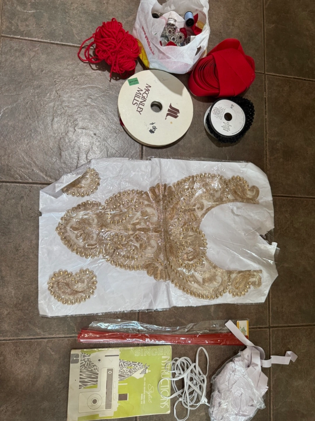 194A collection of sewing supplies including red yarn, ribbons, lace applique, and a Singer Stylist 533 instructions manual. Perfect for your next sewing project!