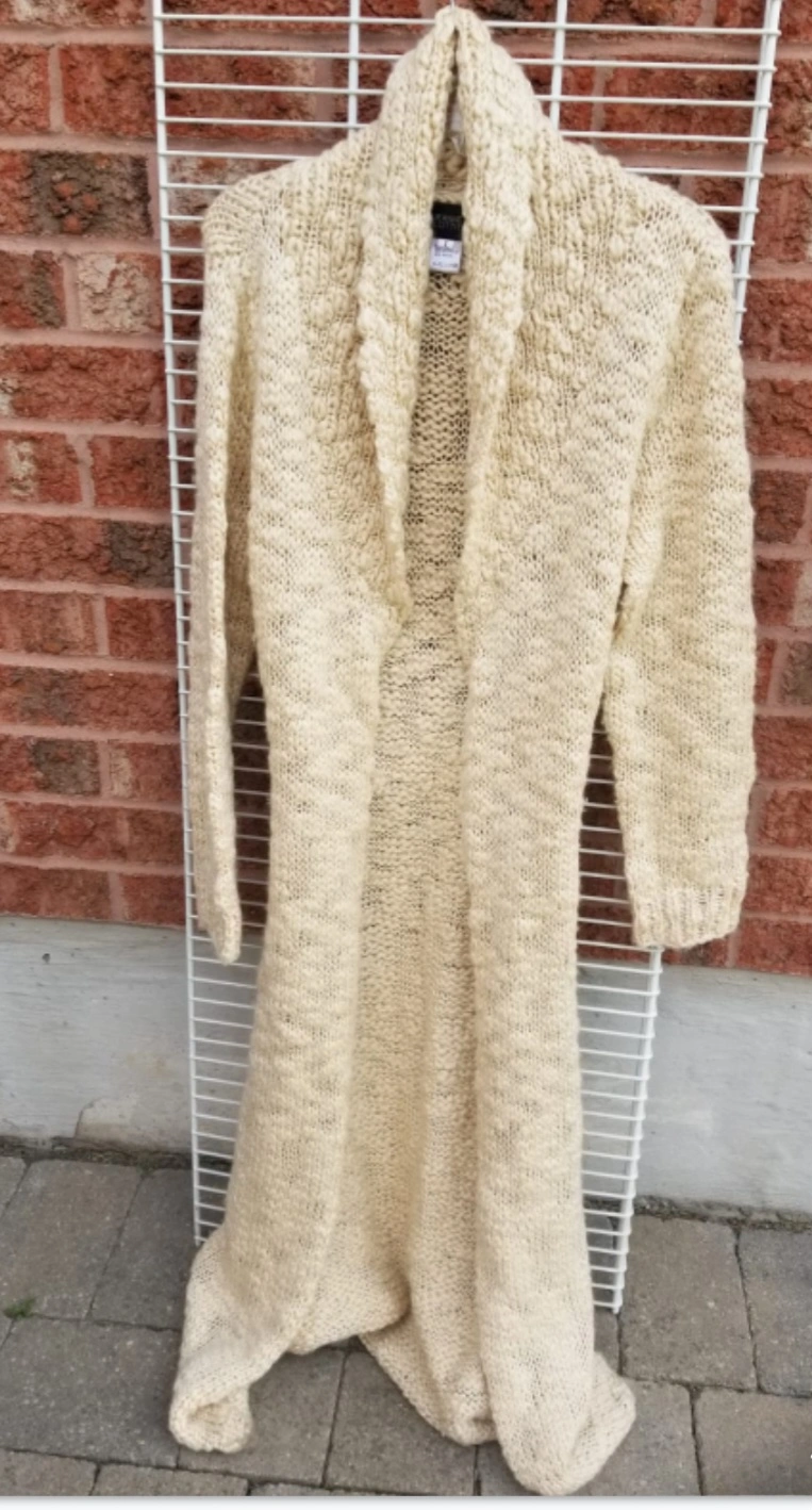 Selling a cozy, long knit cardigan in a cream colour. It's perfect for layering during the cooler months. The material is soft and comfortable, with a blend of wool and acrylic, making it a great addition to any wardrobe!