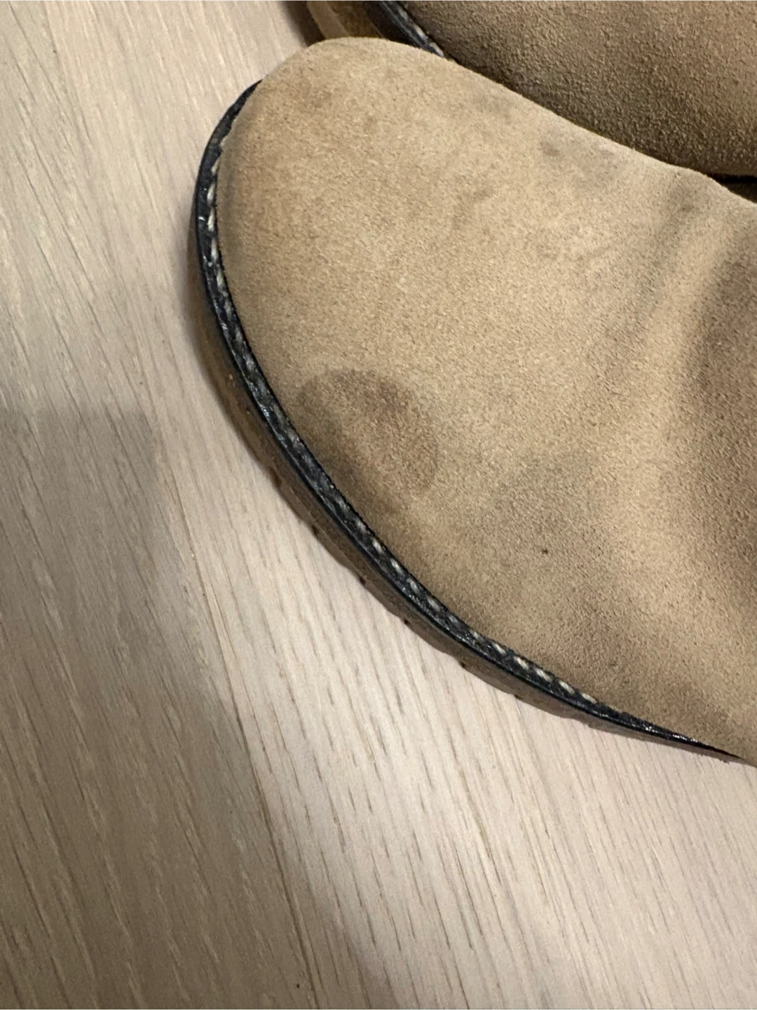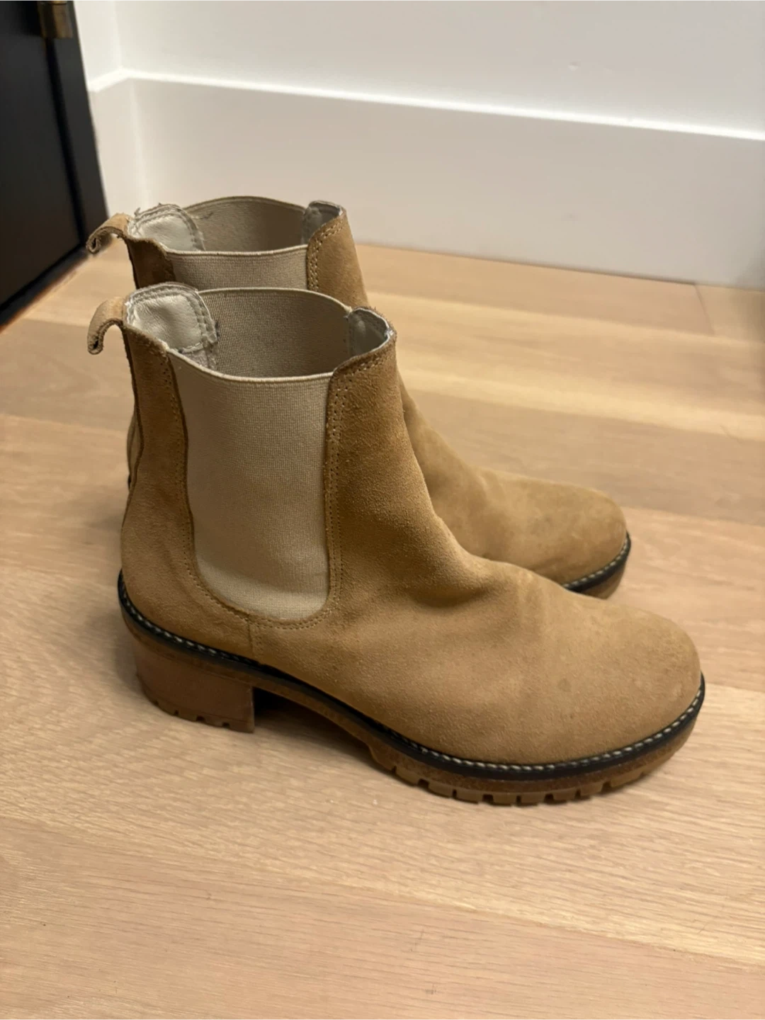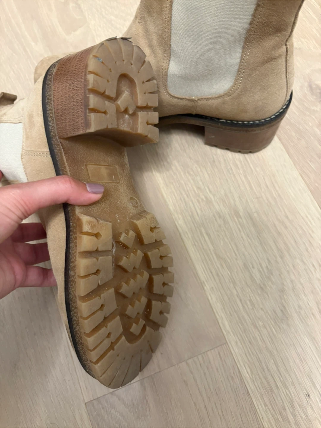 1000+Selling a pair of beige suede Chelsea boots. Size 39. These boots have a lug sole and elastic side panels. There is a mark on the toe of one boot, as shown in the photos. Otherwise, they are in good condition!