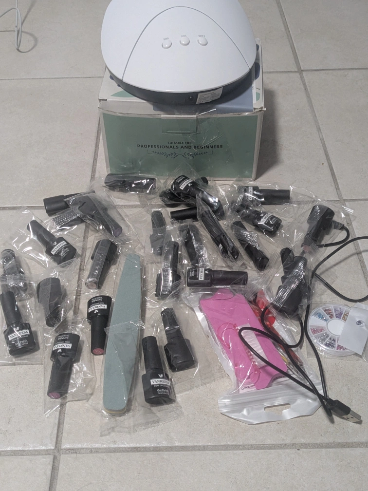 Selling a complete nail gel polish kit that's perfect for both professionals and beginners! It includes a UV lamp and a variety of gel polishes.
