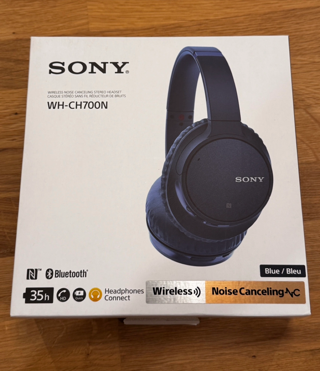 Selling a pair of Sony WH-CH700N wireless noise-cancelling headphones in blue. They're in excellent condition and come with the original box. Enjoy up to 35 hours of battery life for all-day listening. These headphones also feature noise-cancelling technology to help you focus on your music!
