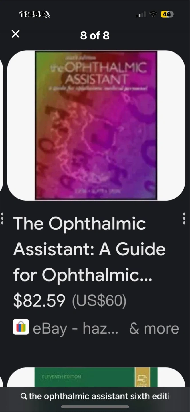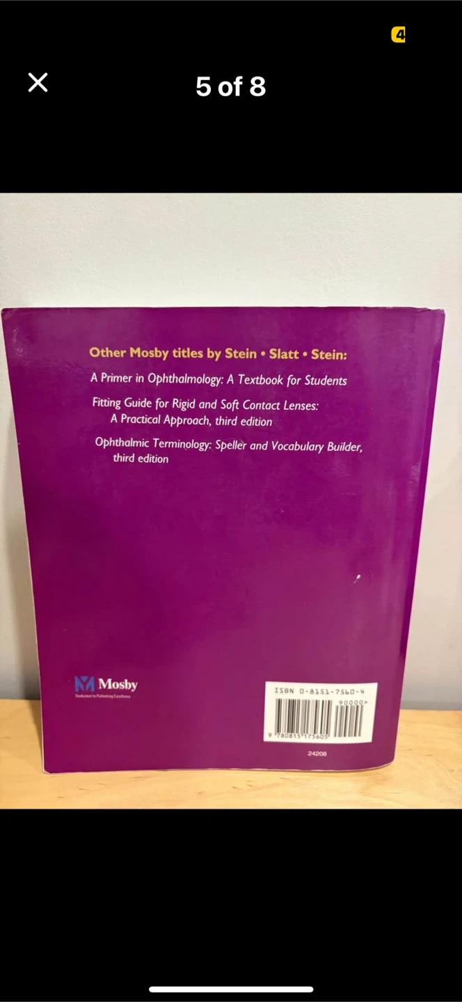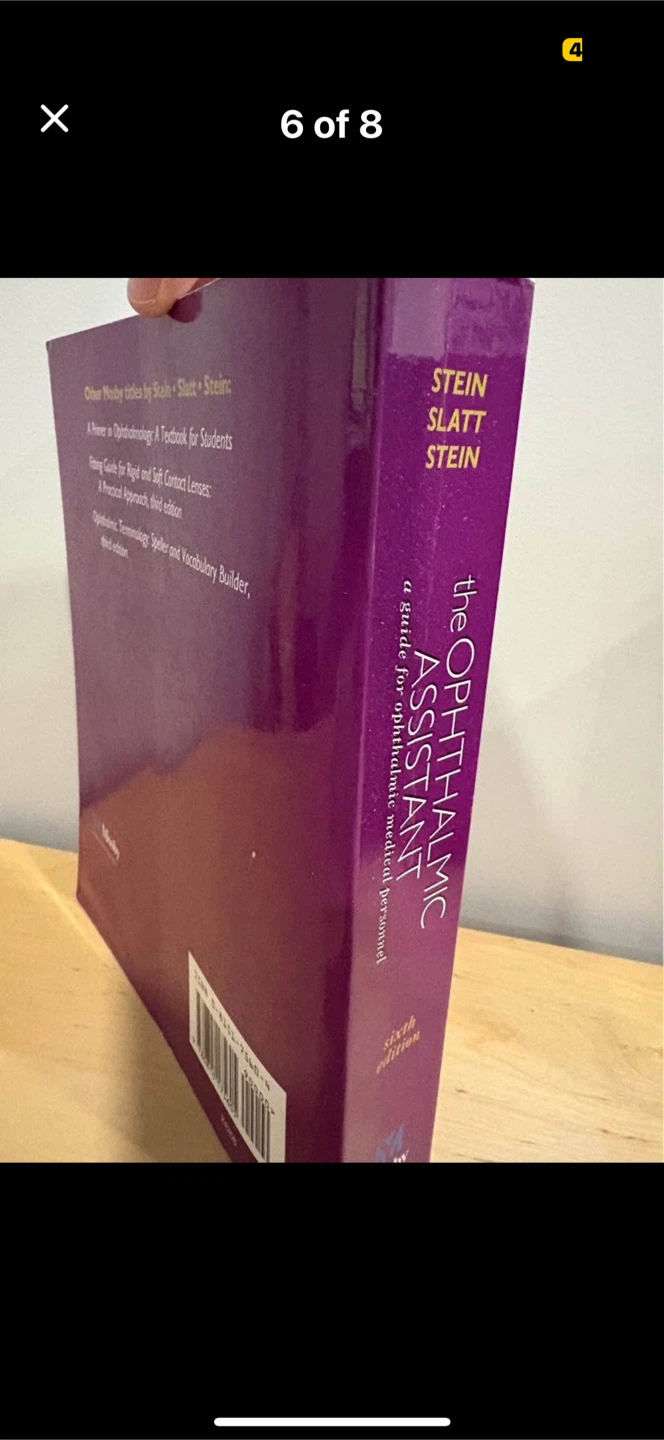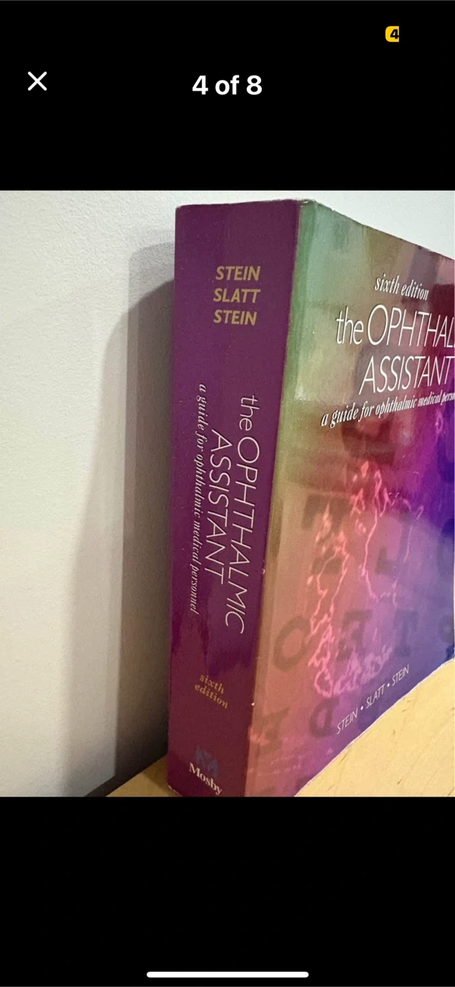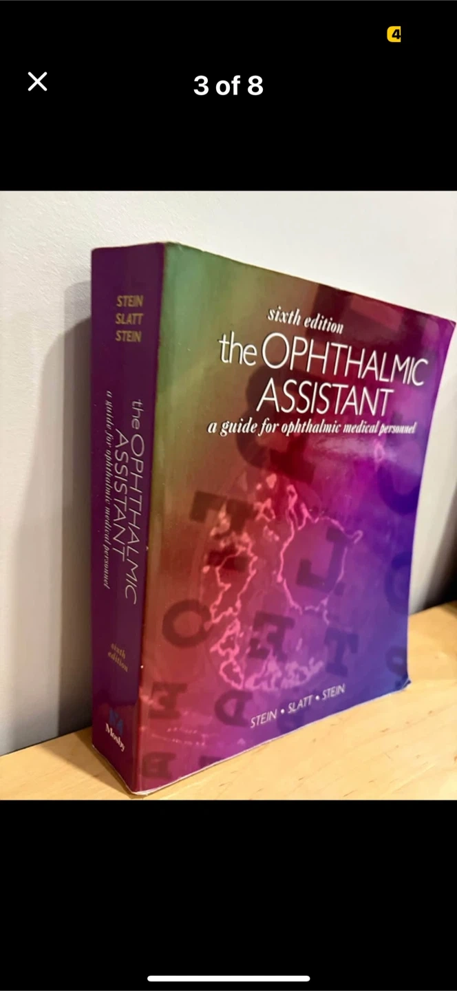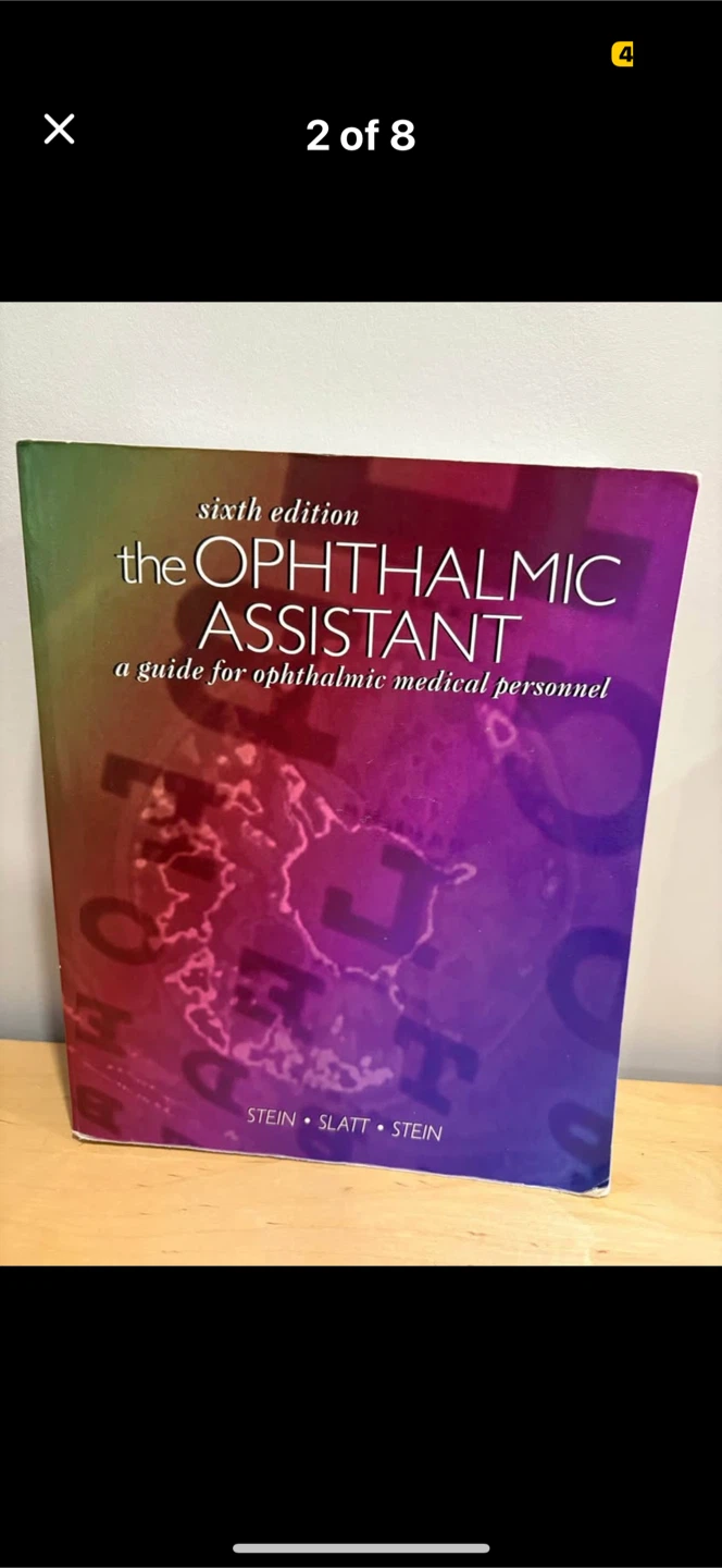 Selling a used copy of "The Ophthalmic Assistant, Sixth Edition" by Stein, Slatt, and Stein. It's a guide for ophthalmic medical personnel. Other Mosby titles by Stein, Slatt, and Stein are also listed on the back, including "A Primer in Ophthalmology: A Textbook for Students", "Fitting Guide for Rigid and Soft Contact Lenses: A Practical Approach", and "Ophthalmic Terminology: Speller and Vocabulary Builder"