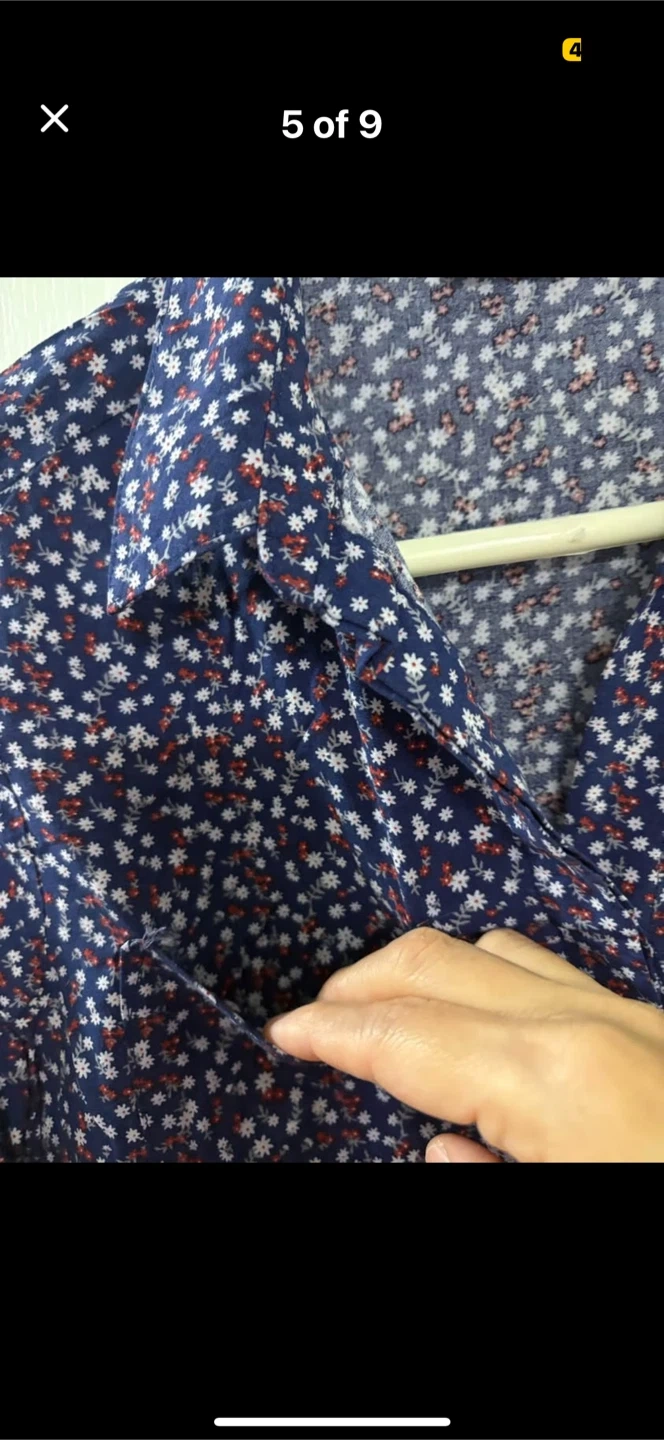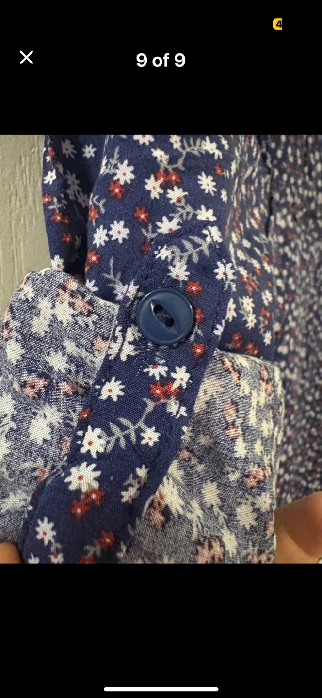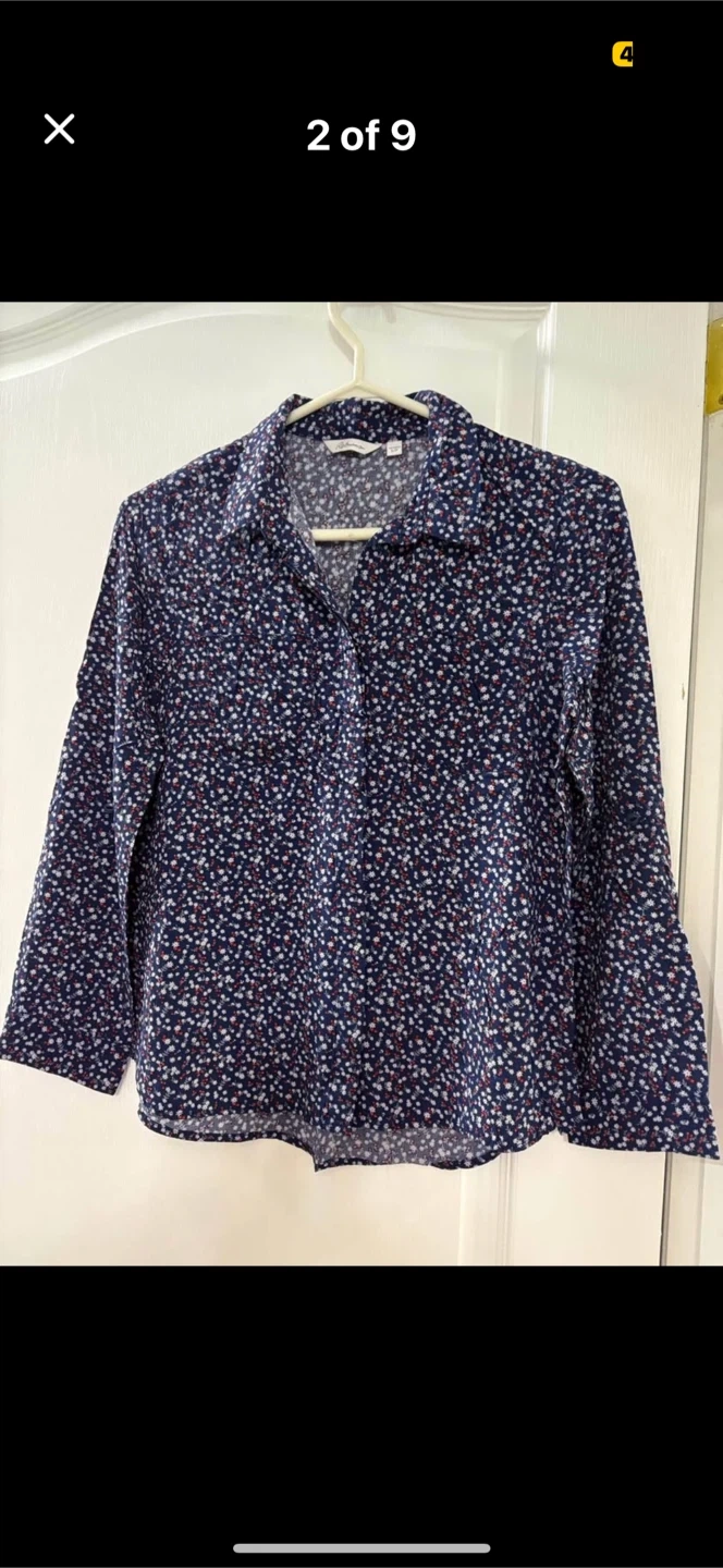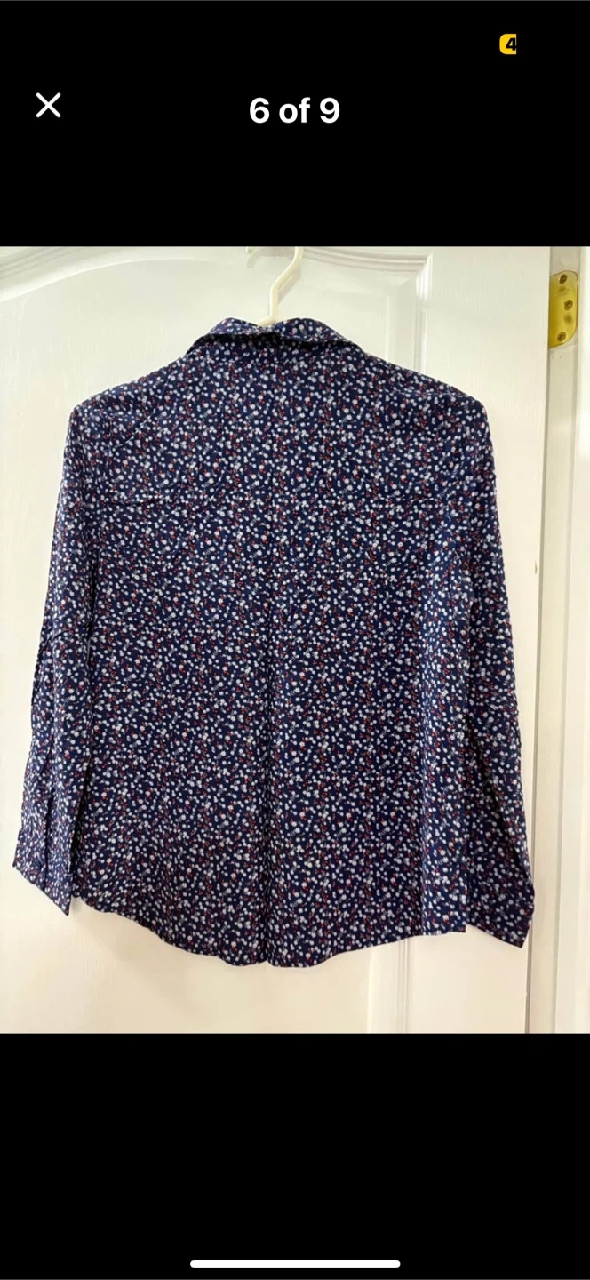 A cute Reitmans blouse in size small! It features a navy blue background with a delicate floral print in white and red. Convertible sleeves folds to 3/4 with buttons. Perfect for adding a touch of charm to your wardrobe