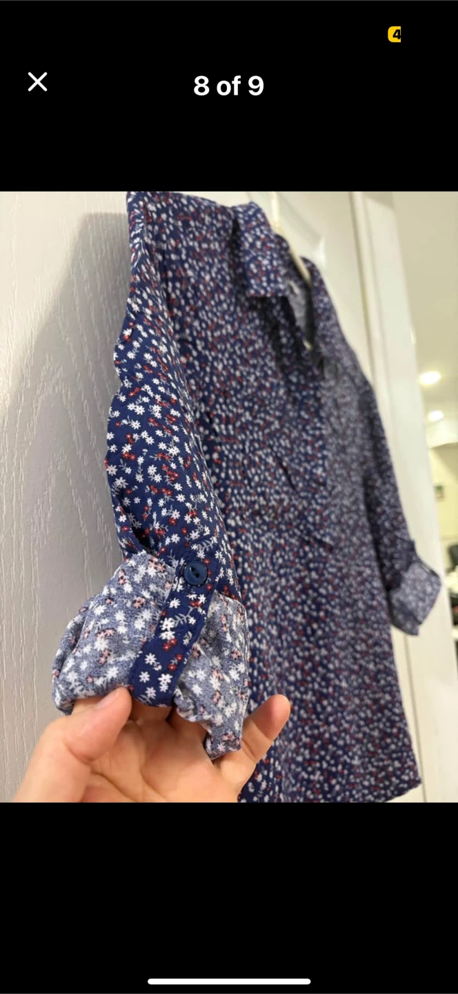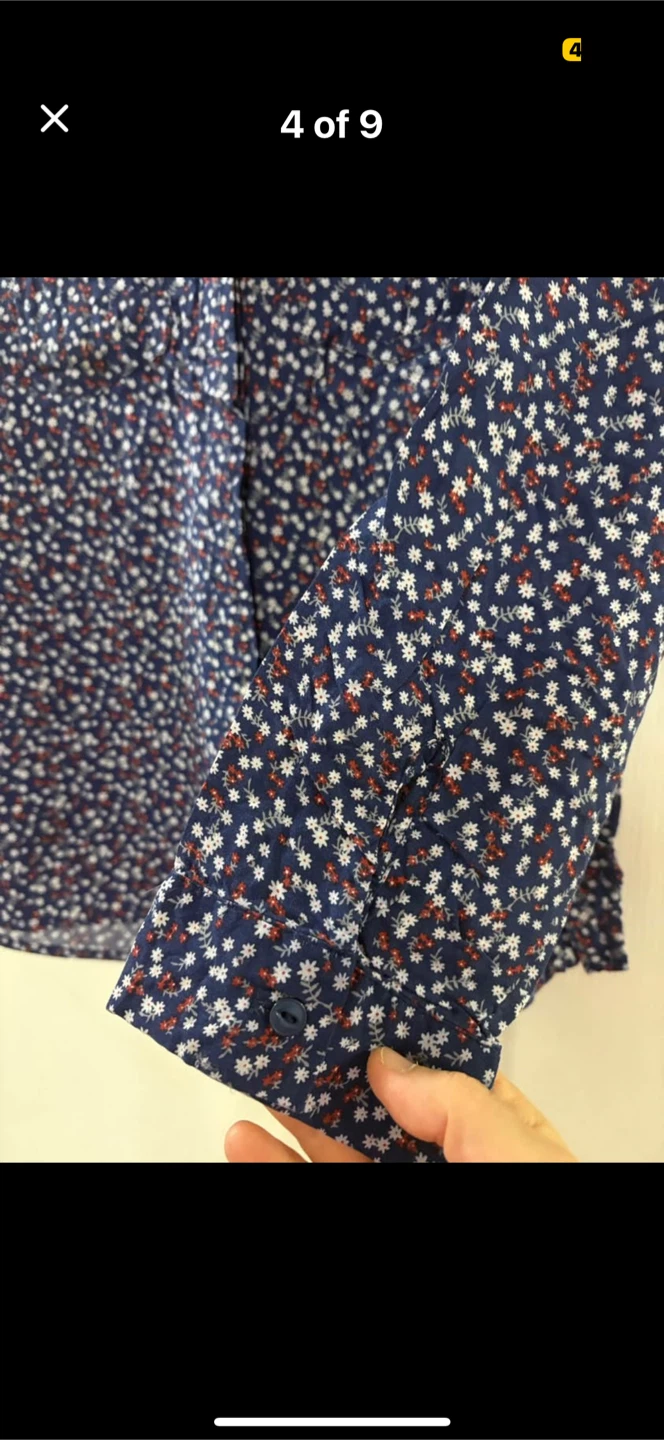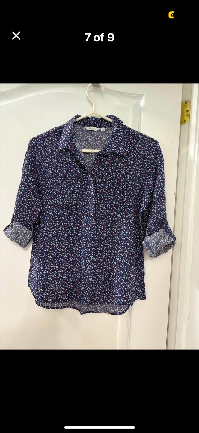 A cute Reitmans blouse in size small! It features a navy blue background with a delicate floral print in white and red. Convertible sleeves folds to 3/4 with buttons. Perfect for adding a touch of charm to your wardrobe
