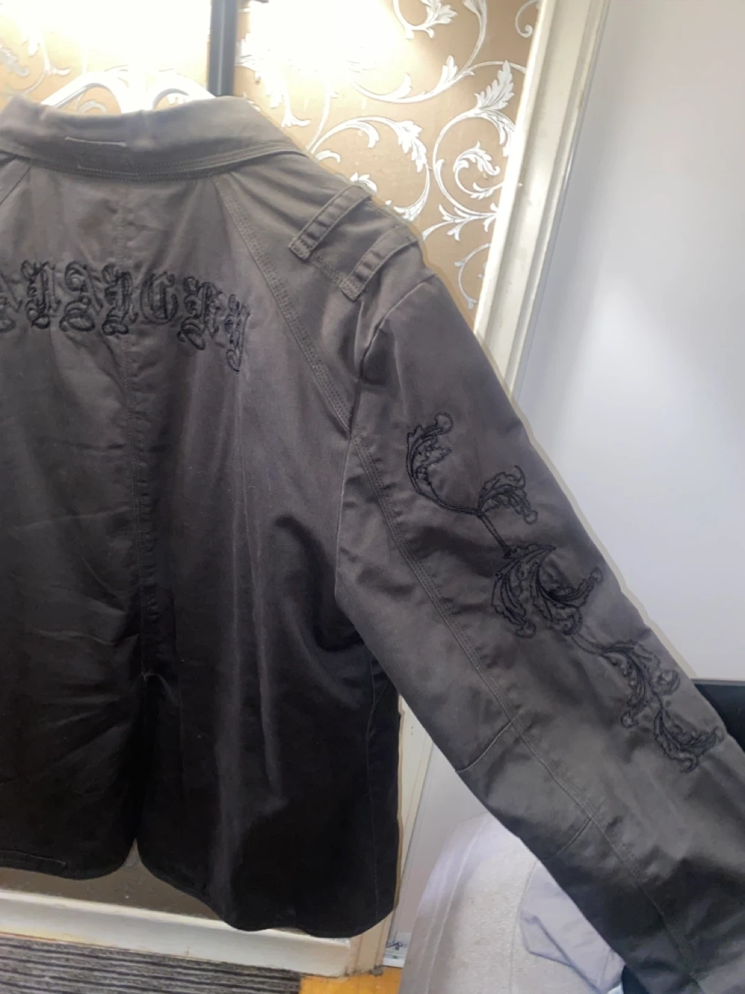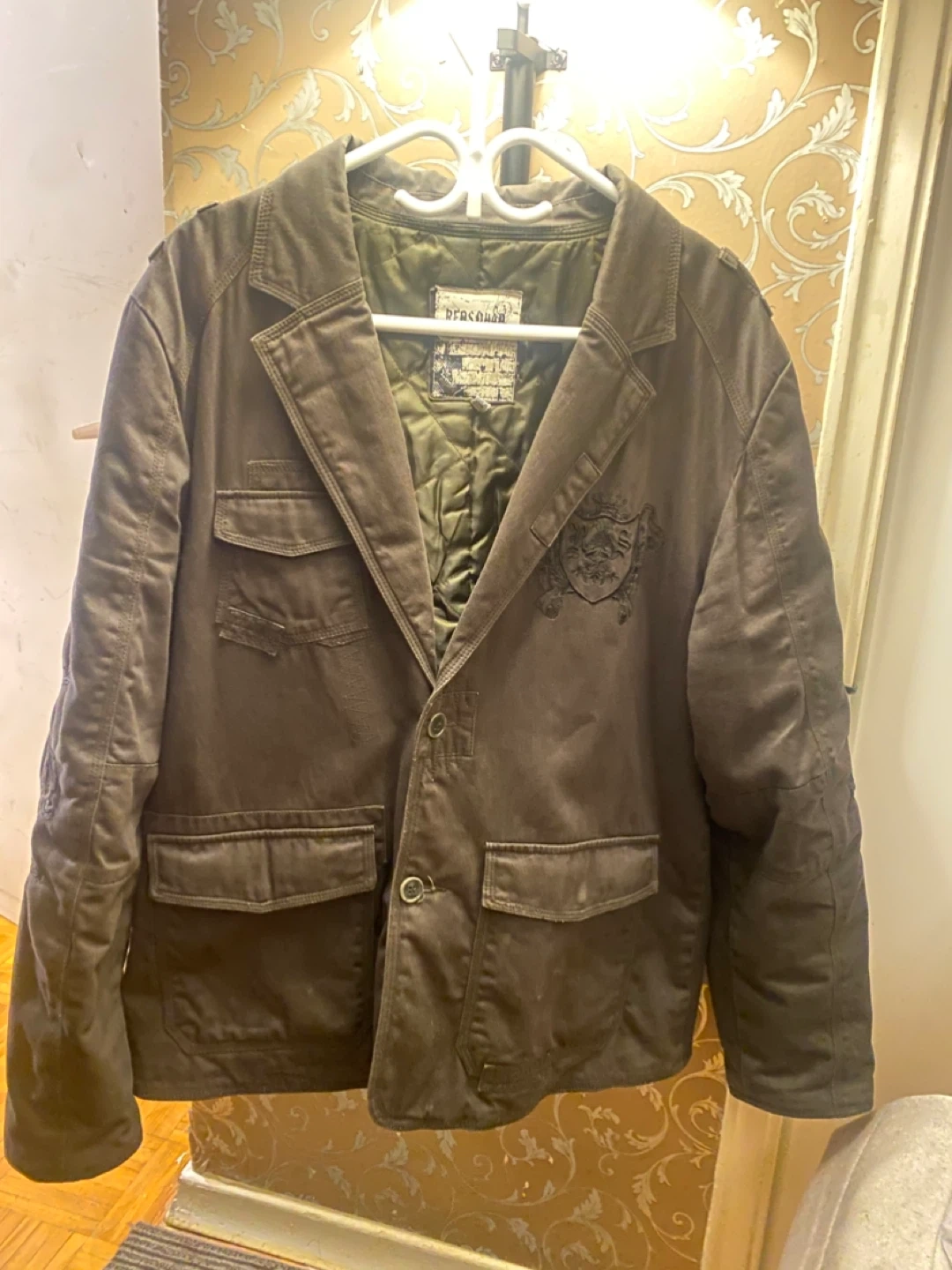 37A military green jacket with unique embroidery on the back and sleeves. It features a button-up front and multiple pockets. And two pockets inside the coat interior. - size xxl