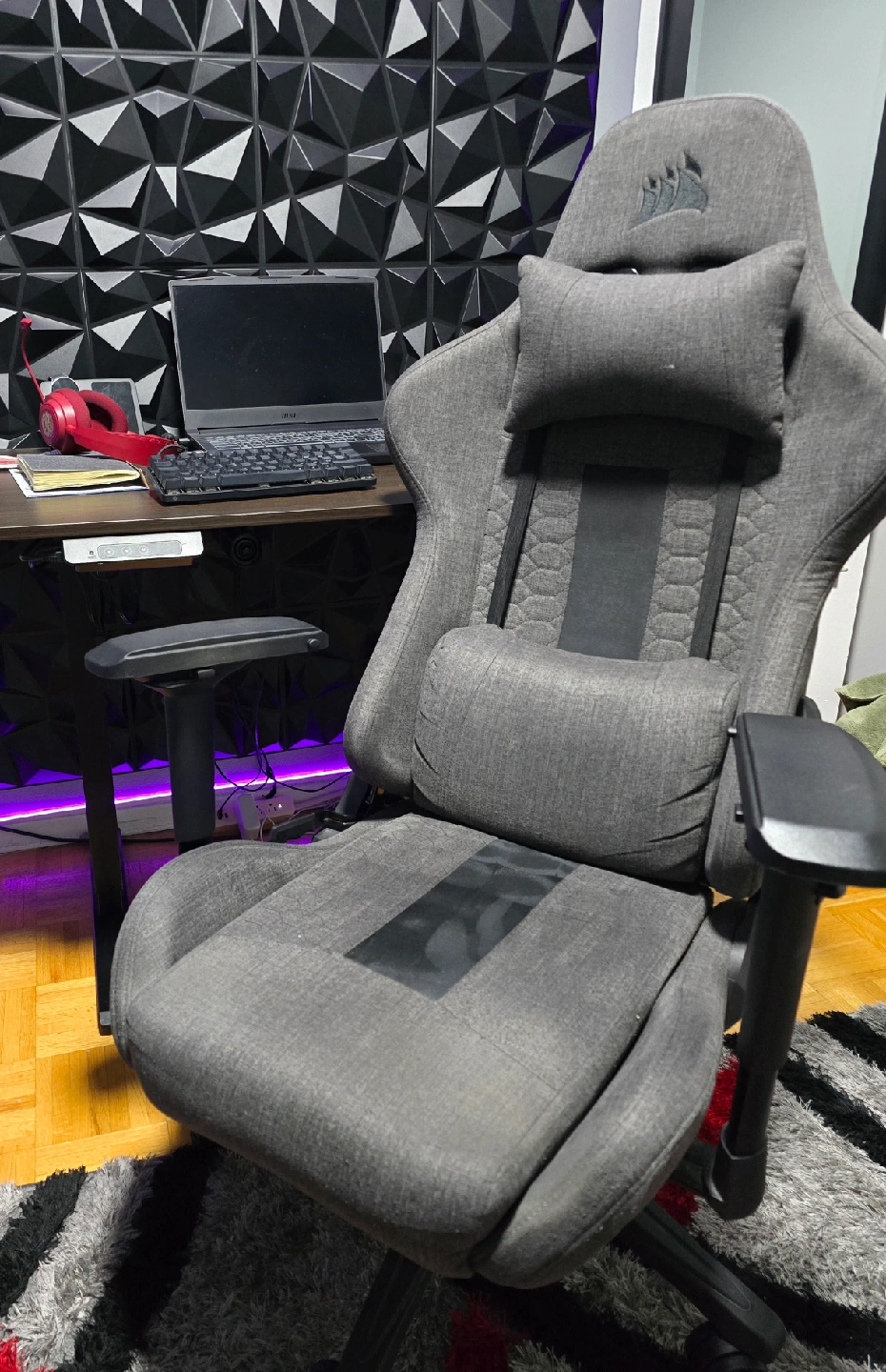 80Selling a Corsair gaming chair in grey. It's in great shape and super comfy for long gaming sessions or working from home! The chair features adjustable armrests and a headrest pillow for extra support. - Used for 7 months (like new) - Extra Set of Handrests Original Brand New + Set from Amazon with extra adjustability - Large Comfortable Chair - Made from Fabric - Headrest & Back Support - Layflat Recline - Height Adjustable Cheaper Than Others With great quality.