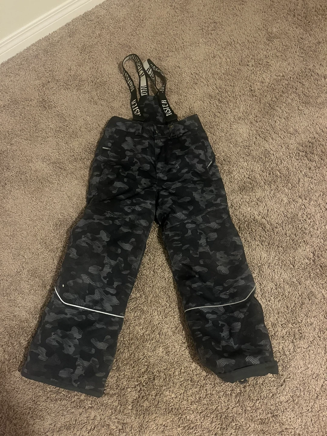 Kids' snow pants by Monster in a black camouflage pattern. These pants have adjustable suspenders and reflective stripes on the lower legs. Perfect for keeping your little one warm and dry during winter activities! Size 10 youth Great condition
