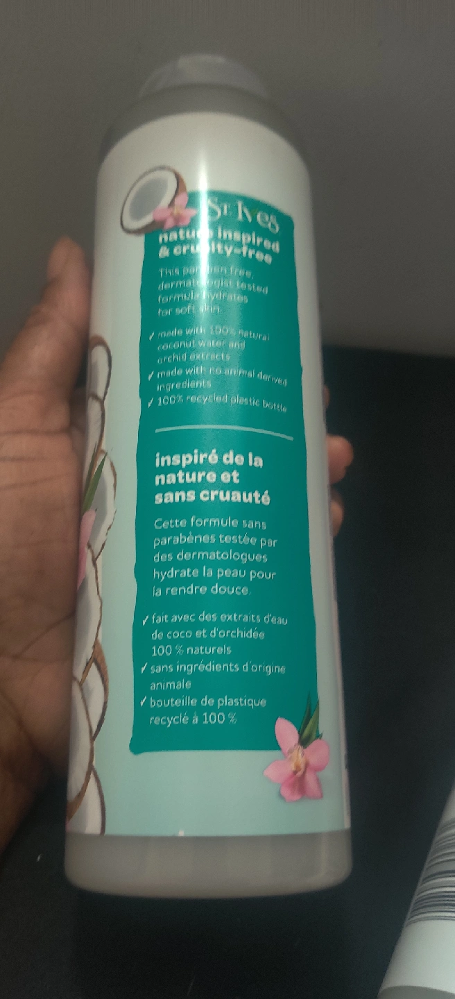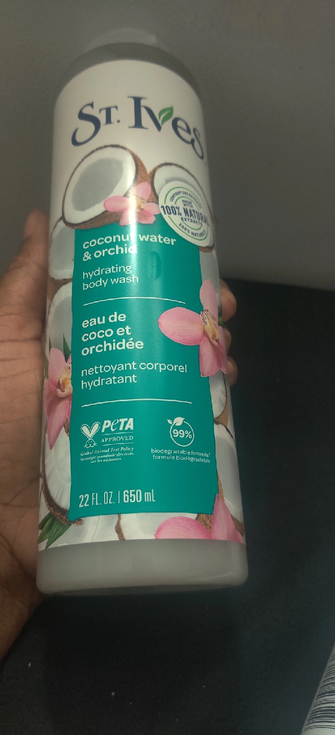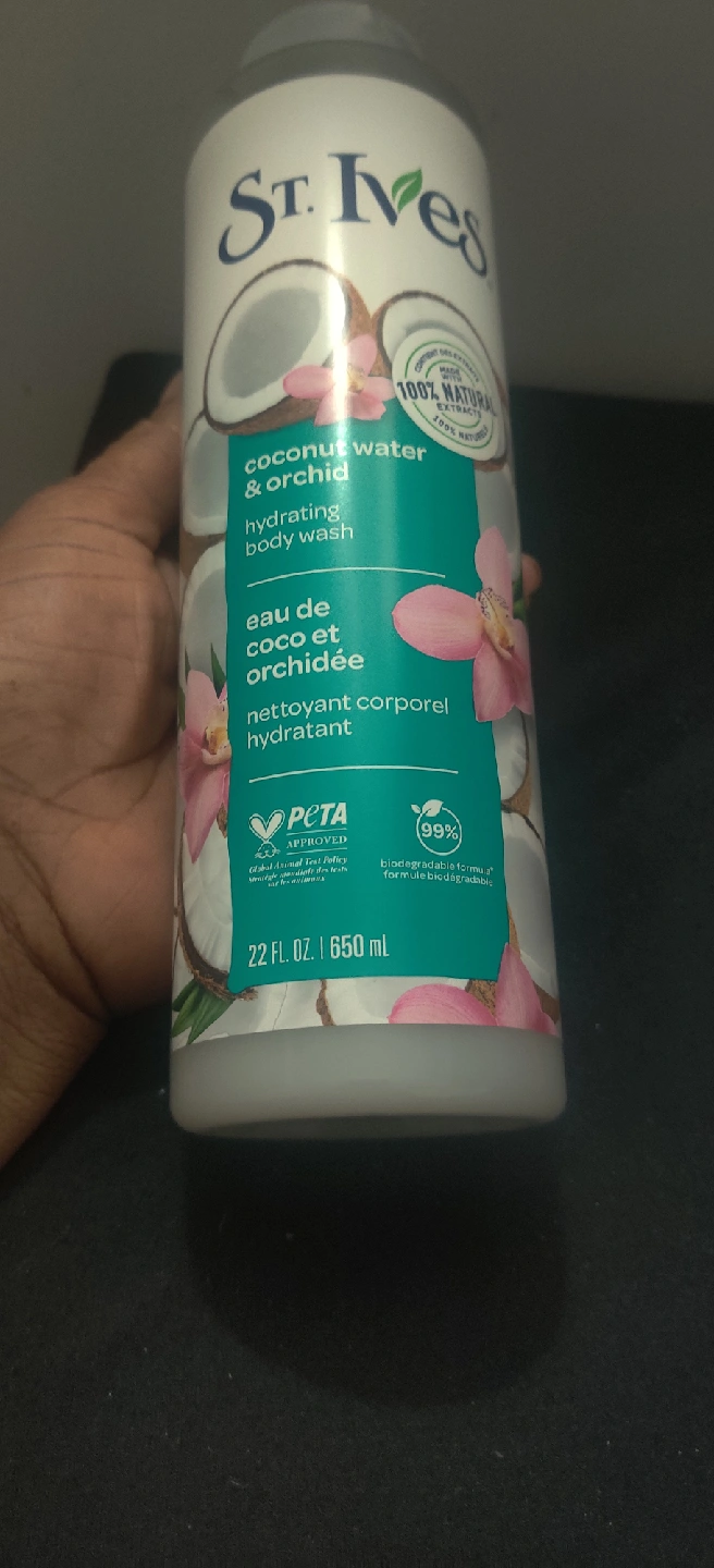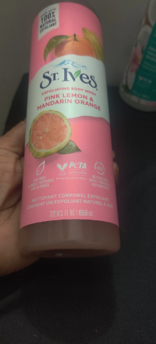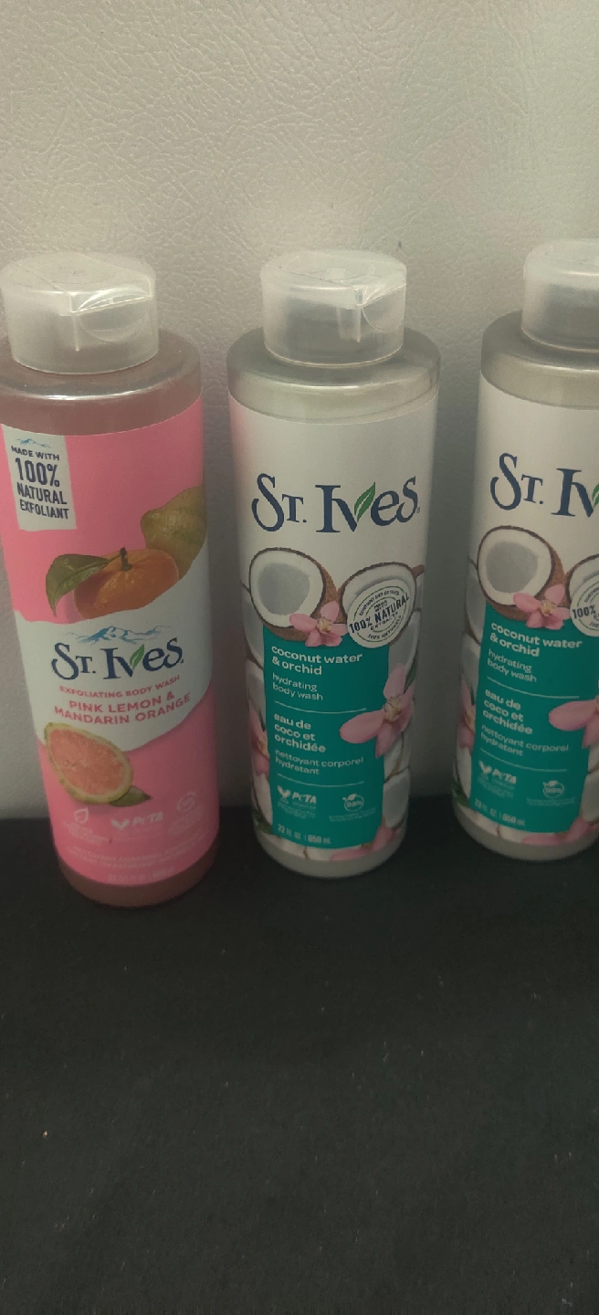 I have 3 bottles of St. Ives body wash available! Two is Coconut Water & Orchid hydrating body wash, and the other is Pink Lemon & Mandarin Orange exfoliating body wash. Both bottles are 22 fl oz / 650 mL and are made with 100% natural ingredients. They're also PETA approved and come in 100% recycled plastic bottles